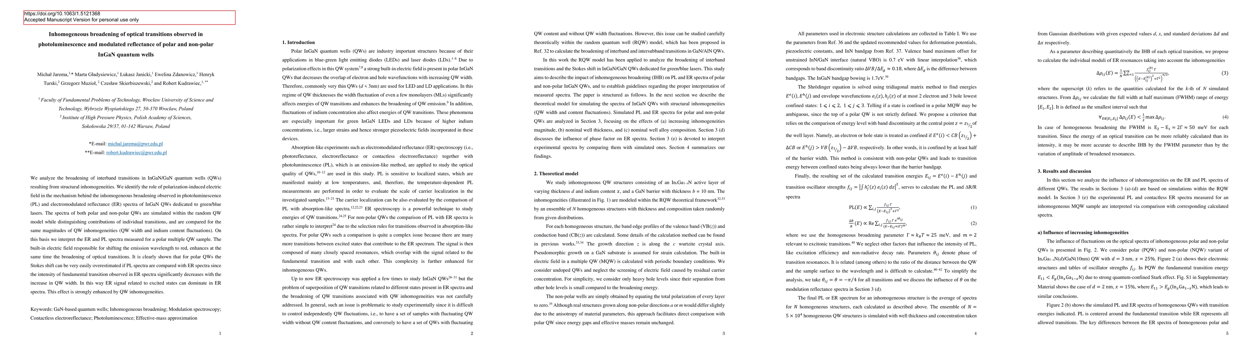 In this work the broadening of interband transitions in InGaN/GaN quantum wells (QWs) resulting from structural inhomogeneities is analyzed. The role of polarization-induced electric field in the mechanism behind the inhomogeneous broadening observed in photoluminescence (PL) and electromodulated reflectance (ER) spectra of InGaN QWs dedicated to green/blue lasers is explained. Spectra of both polar and non-polar QWs are simulated within the random QW model distinguishing contributions of individual transitions taking into account QW inhomogeneities (QW width and indium content fluctuations). On this basis we interpret the ER and PL spectra measured for a polar multiple QW InGaN/GaN structure. The built-in electric field shifts the emission wavelength to red, and enhances the broadening of optical transitions. It is clearly shown that for polar QWs the Stokes shift can be easily overestimated if PL spectra are compared with ER spectra since the intensity of the fundamental transition observed in ER spectra significantly decreases with the increase in QW width. In this way ER signal related to excited states start to dominate. This effect is strongly enhanced by QW inhomogeneities.