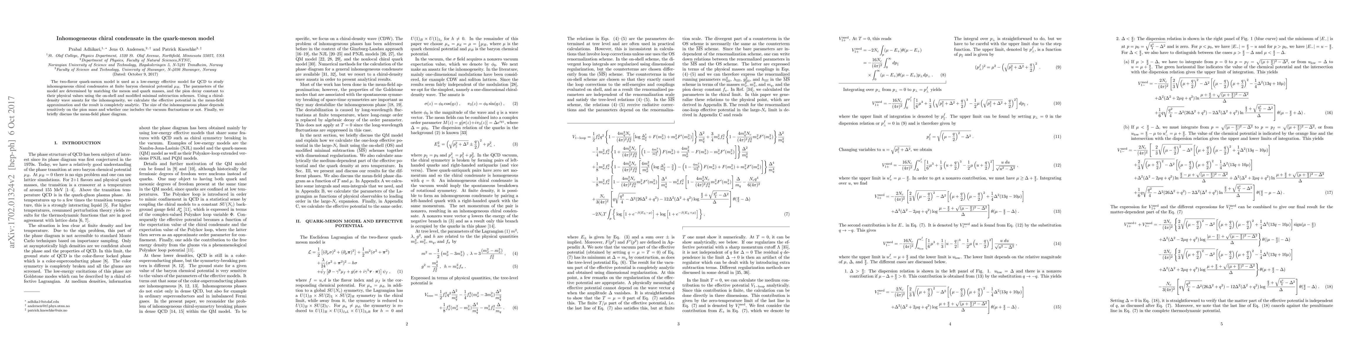 The two-flavor quark-meson model is used as a low-energy effective model for QCD to study inhomogeneous chiral condensates at finite %temperature $T$ baryon chemical potential $\mu_B$. The parameters of the model are determined by matching the meson and quark masses, and the pion decay constant to their physical values using the on-shell and modified minimal subtraction schemes. Using a chiral-density wave ansatz for the inhomogeneity, we calculate the effective potential in the mean-field approximation and the result is completely analytic. The size of the inhomogeneous phase depends sensitively on the pion mass and whether one includes the vacuum fluctuations or not. Finally, we briefly discuss the mean-field phase diagram.
