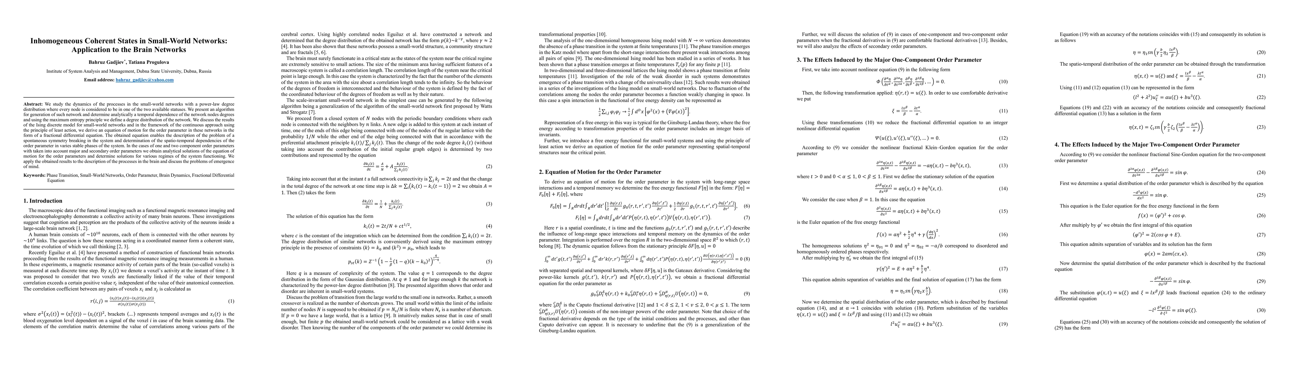 We study the dynamics of the processes in the small-world networks with a power-law degree distribution where every node is considered to be in one of the two available statuses. We present an algorithm for generation of such network and determine analytically a temporal dependence of the network nodes degrees and using the maximum entropy principle we define a degree distribution of the network. We discuss the results of the Ising discrete model for small-world networks and in the framework of the continuous approach using the principle of least action, we derive an equation of motion for the order parameter in these networks in the form of a fractional differential equation. The obtained equation enables the description of the problem of a spontaneous symmetry breaking in the system and determination of the spatio-temporal dependencies of the order parameter in varies stable phases of the system. In the cases of one and two component order parameters with taken into account major and secondary order parameters we obtain analytical solutions of the equation of motion for the order parameters and determine solutions for various regimes of the system functioning. We apply the obtained results to the description of the processes in the brain and discuss the problems of emergence of mind.