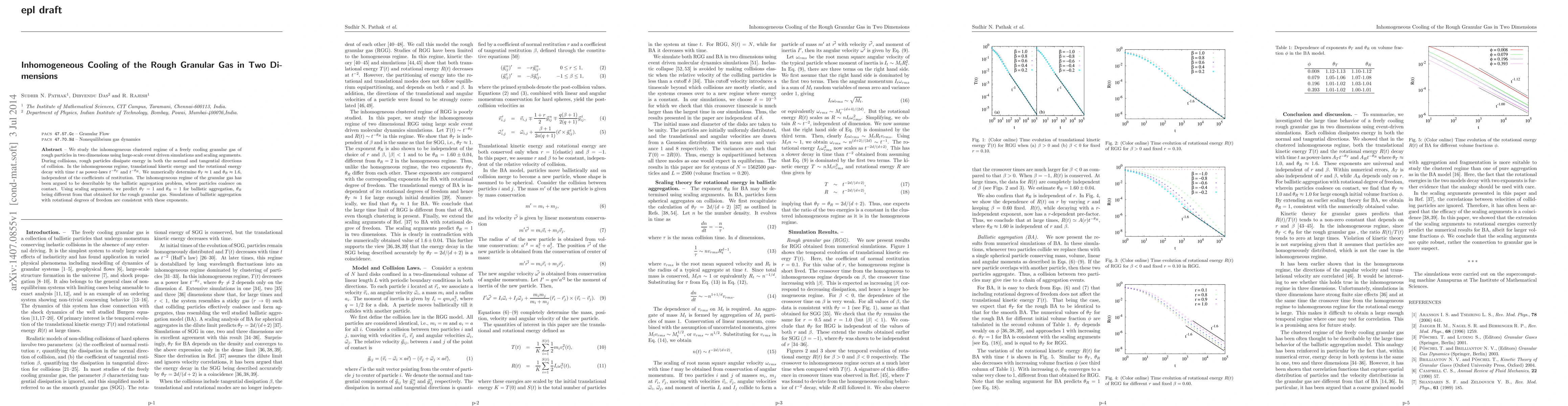 This paper investigates the inhomogeneous cooling regime of a two-dimensional granular gas of rough particles using simulations. The study finds that translational and rotational kinetic energies decay as $t^{-1}$ and $t^{-1.6}$ respectively, independent of restitution coefficients, and compares these results to predictions from ballistic aggregation theory.