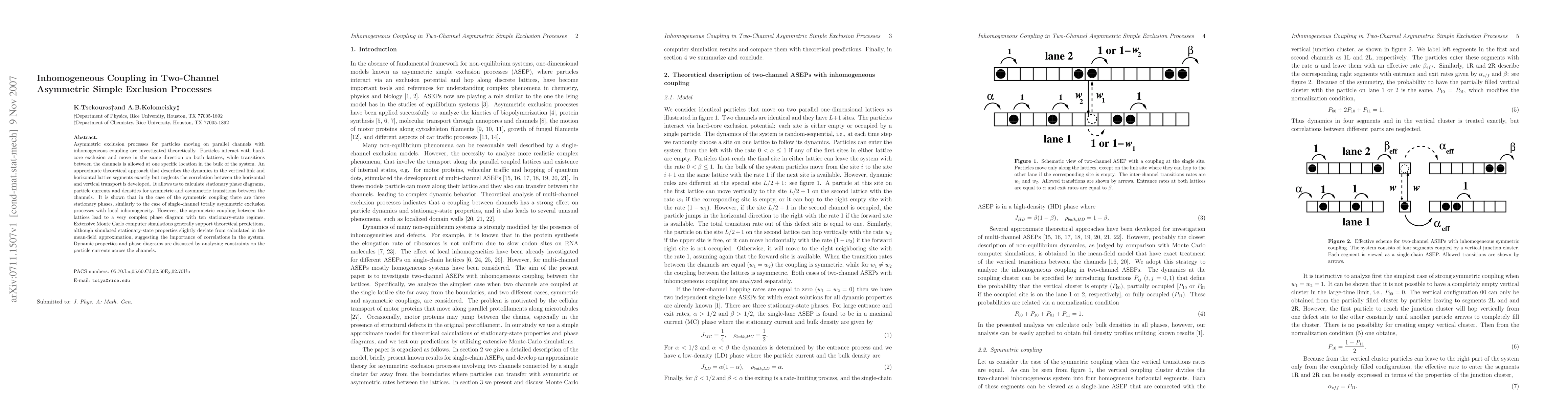This paper investigates asymmetric exclusion processes in two parallel channels with inhomogeneous coupling, developing a theoretical approach to describe the dynamics. The study reveals complex phase diagrams and ten stationary-state regimes under asymmetric coupling, supported by Monte Carlo simulations, though deviations suggest correlations' importance.