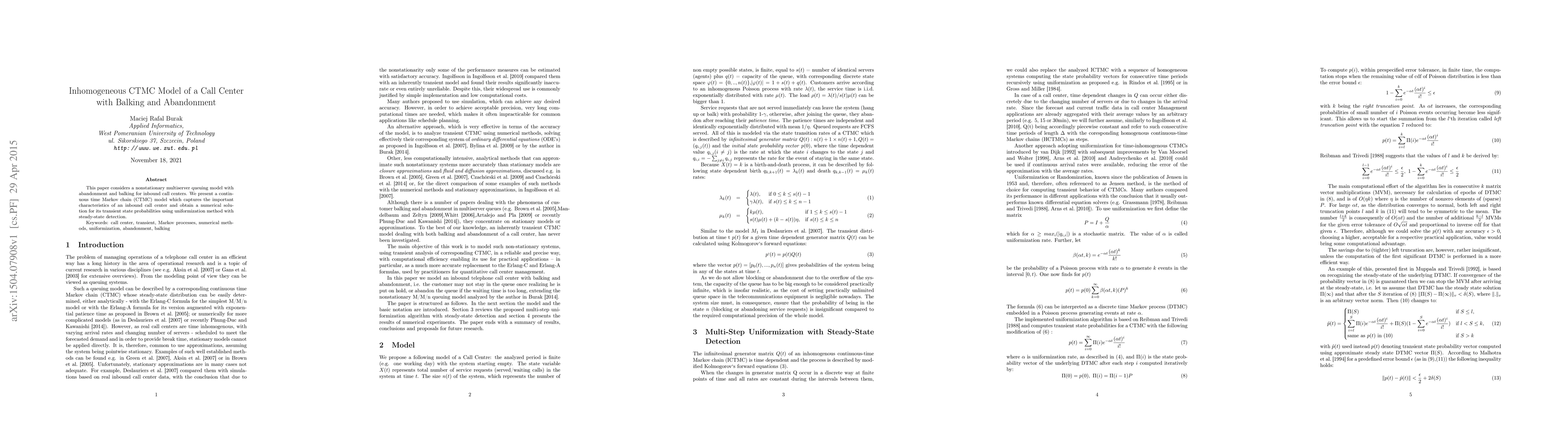 This paper develops a nonstationary continuous time Markov chain (CTMC) model for an inbound call center with abandonment and balking behaviors, and uses the uniformization method to numerically solve for transient state probabilities. The model captures key dynamics of call centers and includes steady-state detection.