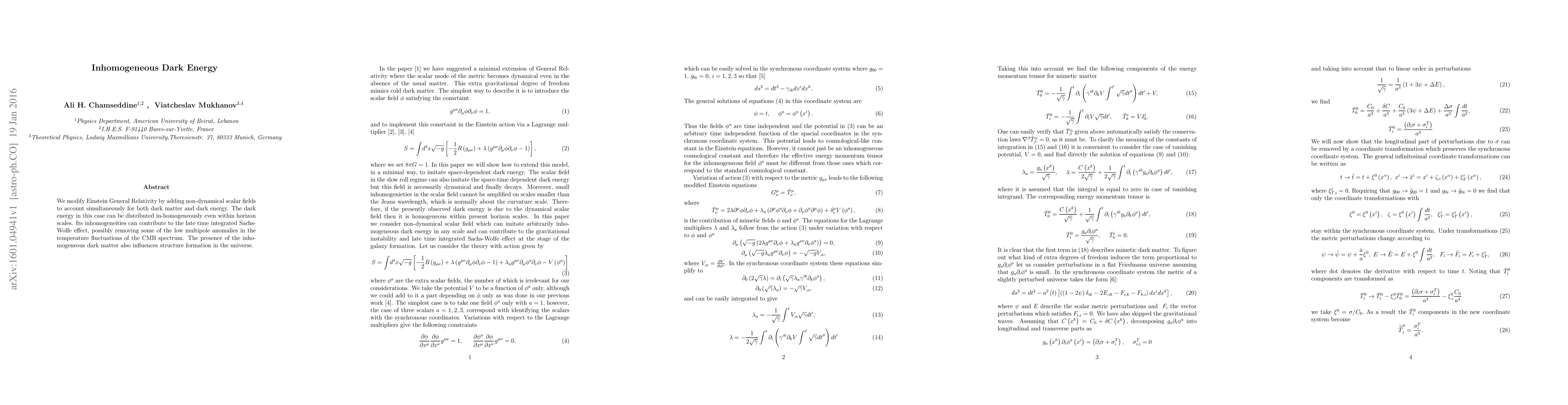 We modify Einstein General Relativity by adding non-dynamical scalar fields to account simultaneously for both dark matter and dark energy. The dark energy in this case can be distributed in-homogeneously even within horizon scales. Its inhomogeneities can contribute to the late time integrated Sachs-Wolfe effect, possibly removing some of the low multipole anomalies in the temperature fluctuations of the CMB spectrum. The presence of the inhomogeneous dark matter also influences structure formation in the universe.