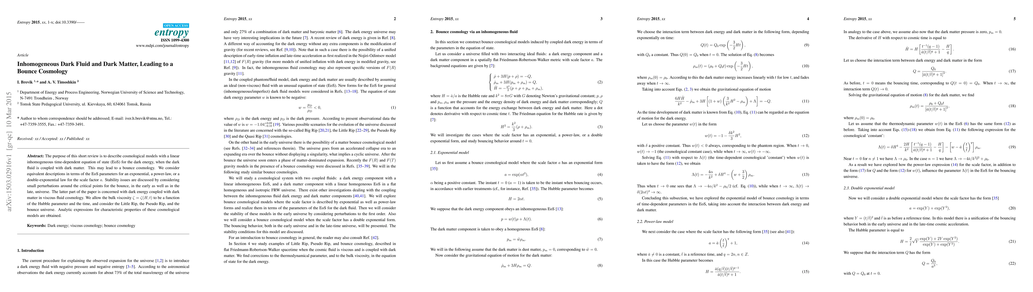 This paper reviews cosmological models featuring a linear inhomogeneous equation of state for dark fluid coupled with dark matter, potentially leading to a bounce cosmology. It investigates stability through small perturbations and examines viscous fluid cosmology with time-dependent bulk viscosity, exploring scenarios like the Little Rip, Pseudo Rip, and bounce universe.