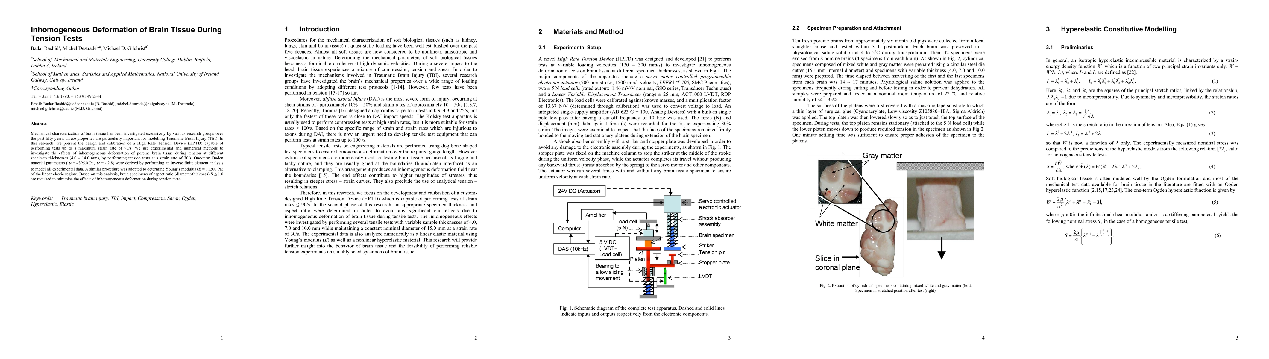 This study designs and calibrates a High Rate Tension Device to investigate the inhomogeneous deformation of porcine brain tissue under tension, finding that specimens with an aspect ratio less than 1.0 minimize deformation effects. The study derives material parameters and Young's modulus using inverse finite element analysis.