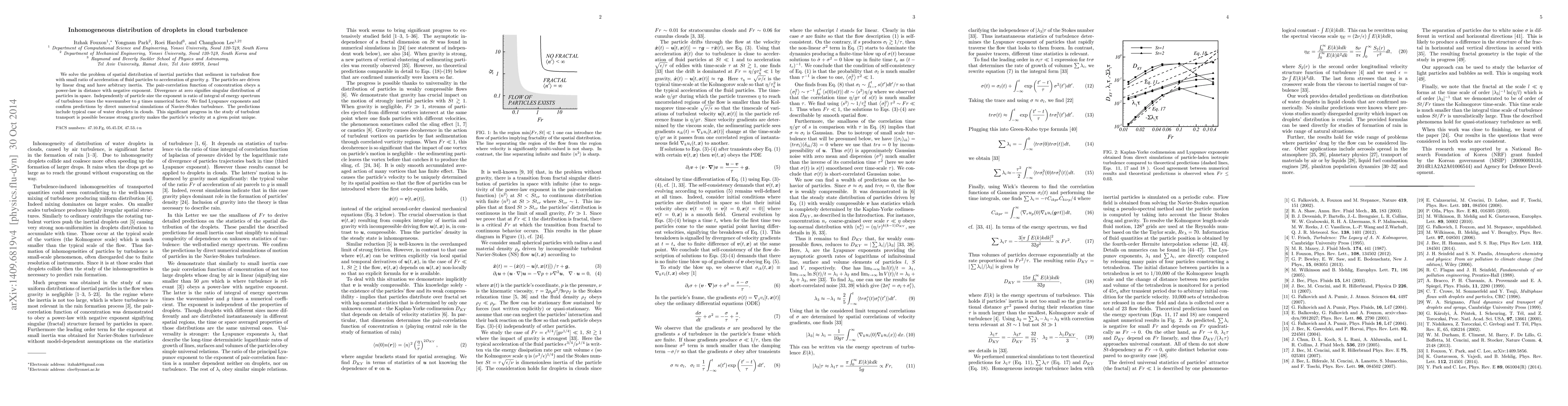 We solve the problem of spatial distribution of inertial particles that sediment in turbulent flow with small ratio of acceleration of fluid particles to acceleration of gravity $g$. The particles are driven by linear drag and have arbitrary inertia. The pair-correlation function of concentration obeys a power-law in distance with negative exponent. Divergence at zero signifies singular distribution of particles in space. Independently of particle size the exponent is ratio of integral of energy spectrum of turbulence times the wavenumber to $g$ times numerical factor. We find Lyapunov exponents and confirm predictions by direct numerical simulations of Navier-Stokes turbulence. The predictions include typical case of water droplets in clouds. This significant progress in the study of turbulent transport is possible because strong gravity makes the particle's velocity at a given point unique.