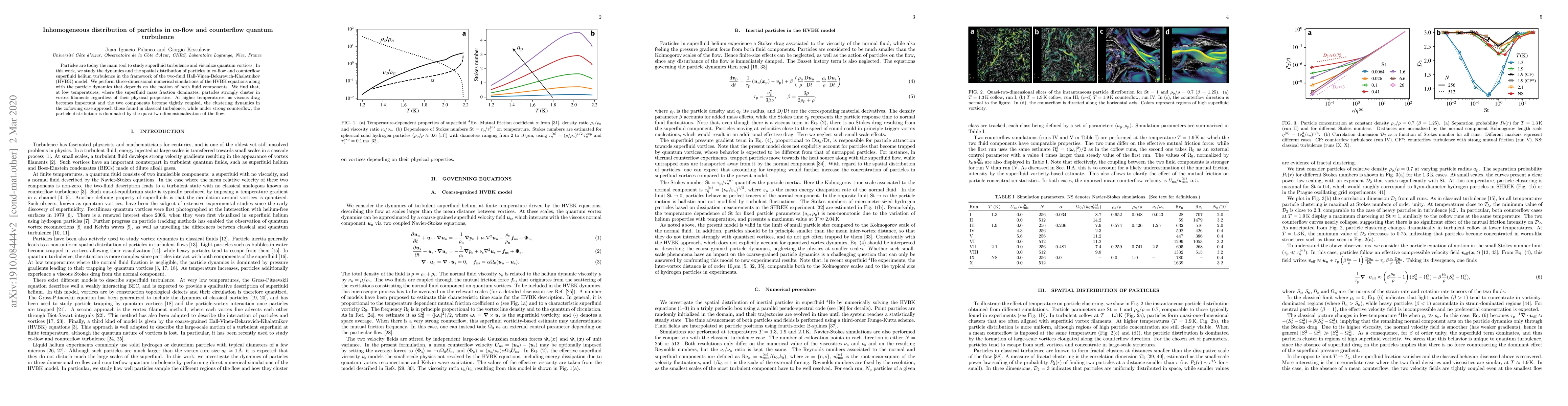 This study investigates the dynamics and spatial distribution of particles in superfluid helium turbulence using the HVBK model, revealing strong particle clustering in vortex filaments at low temperatures. At higher temperatures, particle behavior shifts towards classical turbulence in coflow conditions and quasi-two-dimensional flow under strong counterflow.