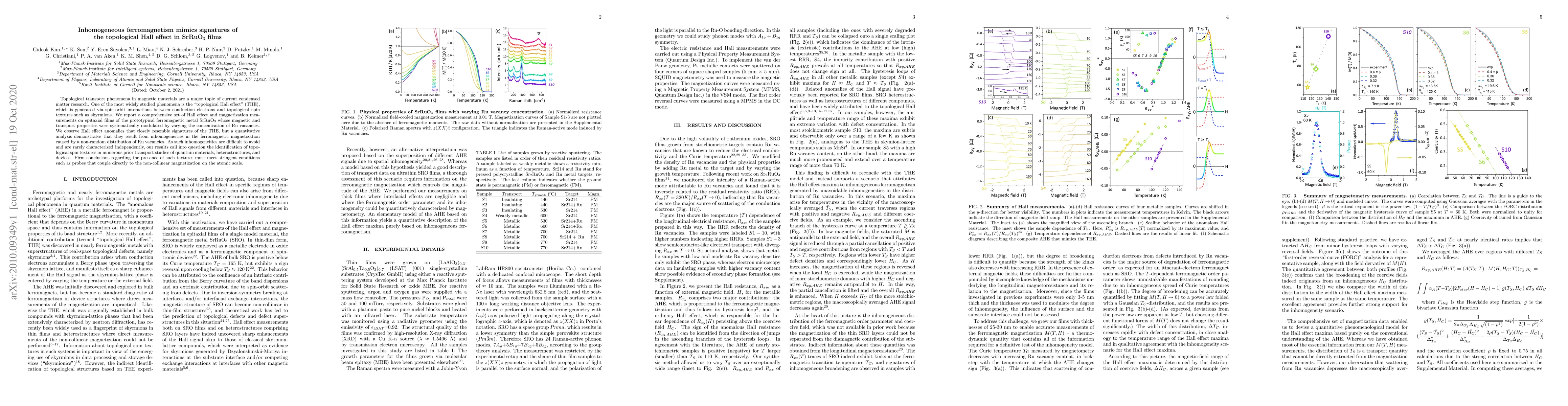 Topological transport phenomena in magnetic materials are a major topic of current condensed matter research. One of the most widely studied phenomena is the ``topological Hall effect'' (THE), which is generated via spin-orbit interactions between conduction electrons and topological spin textures such as skyrmions. We report a comprehensive set of Hall effect and magnetization measurements on epitaxial films of the prototypical ferromagnetic metal SrRuO$_3$ the magnetic and transport properties of which were systematically modulated by varying the concentration of Ru vacancies. We observe Hall effect anomalies that closely resemble signatures of the THE, but a quantitative analysis demonstrates that they result from inhomogeneities in the ferromagnetic magnetization caused by a non-random distribution of Ru vacancies. As such inhomogeneities are difficult to avoid and are rarely characterized independently, our results call into question the identification of topological spin textures in numerous prior transport studies of quantum materials, heterostructures, and devices. Firm conclusions regarding the presence of such textures must meet stringent conditions such as probes that couple directly to the non-collinear magnetization on the atomic scale.