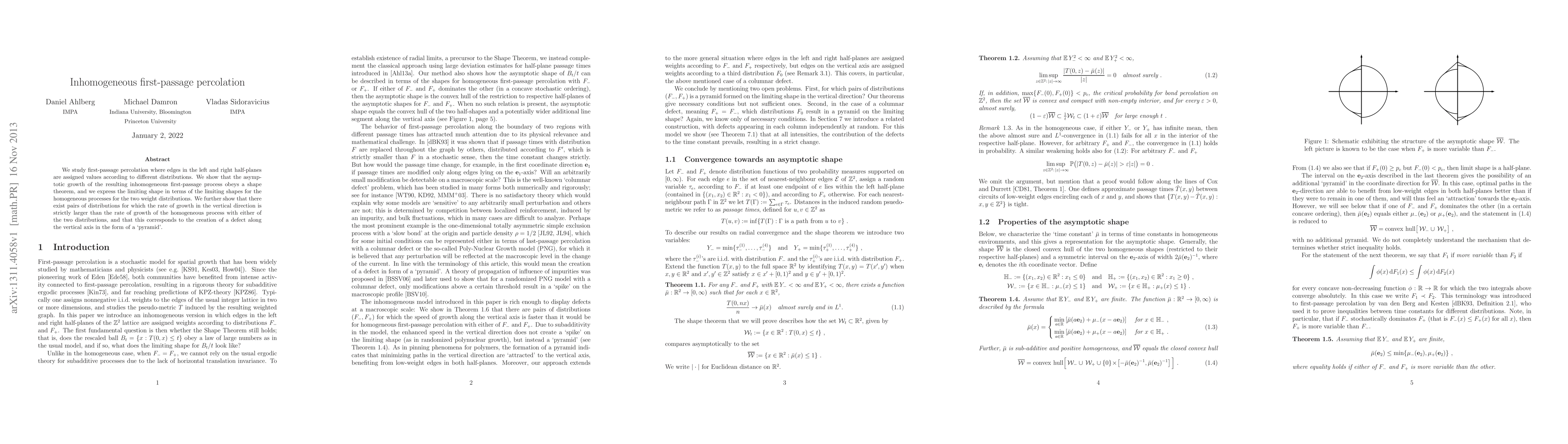 We study first-passage percolation where edges in the left and right half-planes are assigned values according to different distributions. We show that the asymptotic growth of the resulting inhomogeneous first-passage process obeys a shape theorem, and we express the limiting shape in terms of the limiting shapes for the homogeneous processes for the two weight distributions. We further show that there exist pairs of distributions for which the rate of growth in the vertical direction is strictly larger than the rate of growth of the homogeneous process with either of the two distributions, and that this corresponds to the creation of a defect along the vertical axis in the form of a `pyramid'.