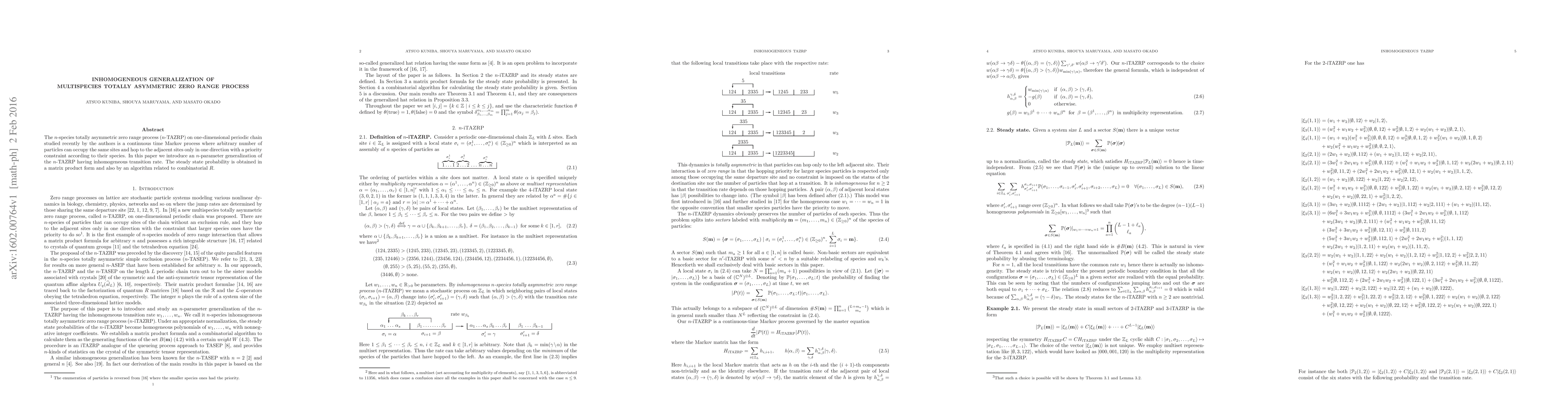 The $n$-species totally asymmetric zero range process ($n$-TAZRP) on one-dimensional periodic chain studied recently by the authors is a continuous time Markov process where arbitrary number of particles can occupy the same sites and hop to the adjacent sites only in one direction with a priority constraint according to their species. In this paper we introduce an $n$-parameter generalization of the $n$-TAZRP having inhomogeneous transition rate. The steady state probability is obtained in a matrix product form and also by an algorithm related to combinatorial $R$.