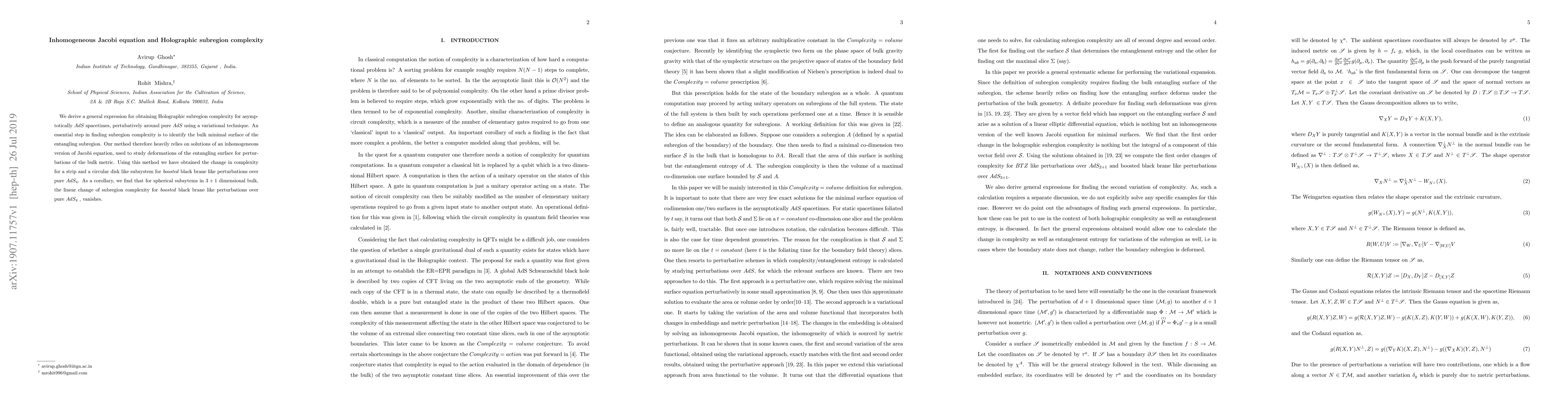 This paper derives a general expression for holographic subregion complexity in asymptotically AdS spacetimes using variational techniques and the inhomogeneous Jacobi equation. It finds that for boosted black brane perturbations over pure AdS₄, the linear change in subregion complexity vanishes for spherical subsystems in 3+1 dimensional bulk.