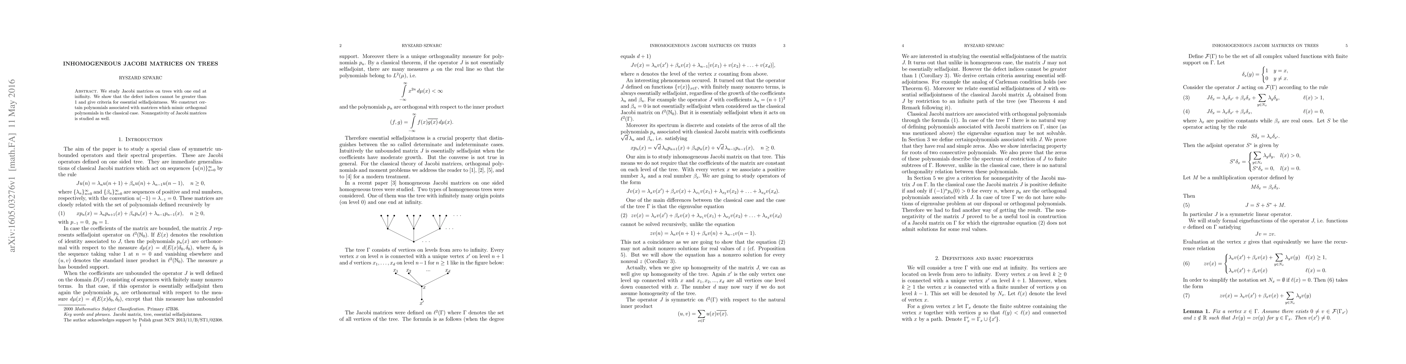 The paper introduces methods for analyzing defect indices and self-adjointness of Jacobi matrices on trees, along with constructing polynomials associated with these matrices.