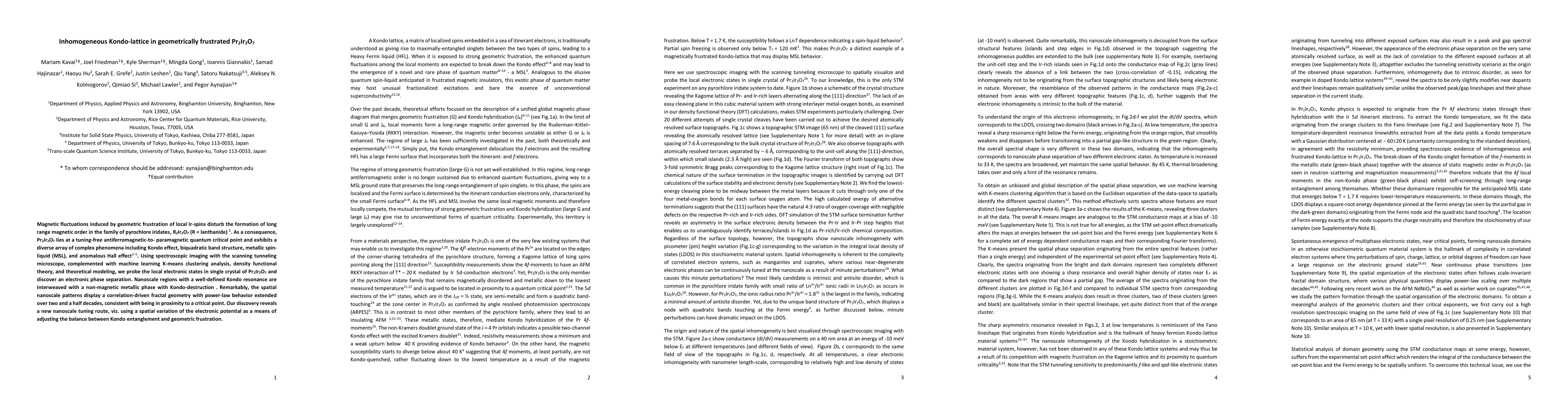 Magnetic fluctuations induced by geometric frustration of local Ir-spins disturb the formation of long range magnetic order in the family of pyrochlore iridates, R$_{2}$Ir$_{2}$O$_{7}$ (R = lanthanide)$^{1}$. As a consequence, Pr$_{2}$Ir$_{2}$O$_{7}$ lies at a tuning-free antiferromagnetic-to-paramagnetic quantum critical point and exhibits a diverse array of complex phenomena including Kondo effect, biquadratic band structure, metallic spin-liquid (MSL), and anomalous Hall effect$^{2-5}$. Using spectroscopic imaging with the scanning tunneling microscope, complemented with machine learning K-means clustering analysis, density functional theory, and theoretical modeling, we probe the local electronic states in single crystal of Pr$_{2}$Ir$_{2}$O$_{7}$ and discover an electronic phase separation. Nanoscale regions with a well-defined Kondo resonance are interweaved with a non-magnetic metallic phase with Kondo-destruction. Remarkably, the spatial nanoscale patterns display a correlation-driven fractal geometry with power-law behavior extended over two and a half decades, consistent with being in proximity to a critical point. Our discovery reveals a new nanoscale tuning route, viz. using a spatial variation of the electronic potential as a means of adjusting the balance between Kondo entanglement and geometric frustration.