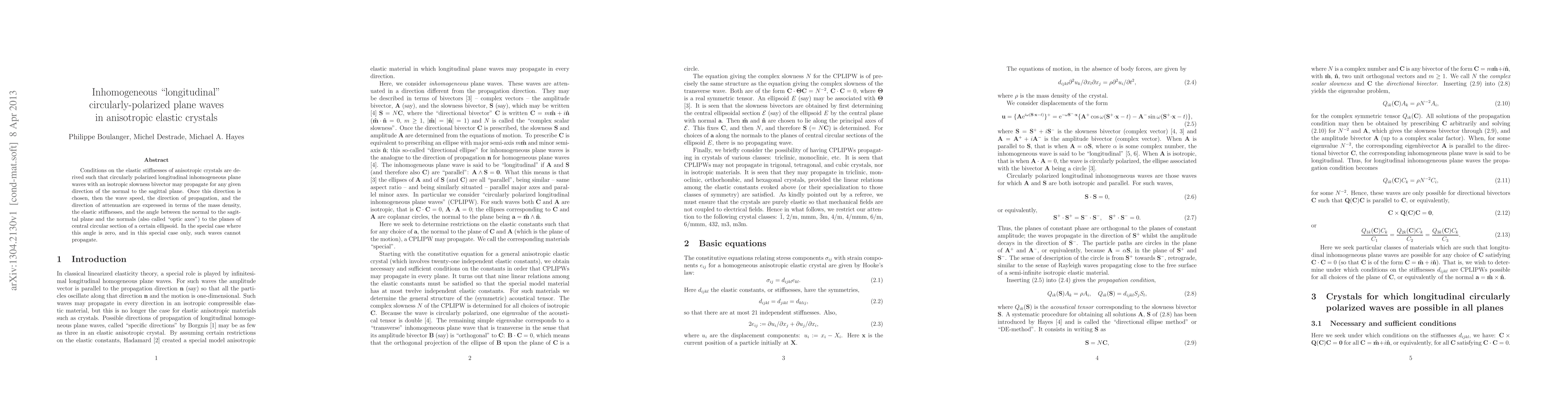 This paper derives conditions for the propagation of circularly polarized longitudinal inhomogeneous plane waves in anisotropic elastic crystals, revealing that wave speed and direction depend on elastic stiffnesses and the angle between normals to specific planes, with no propagation when this angle is zero.