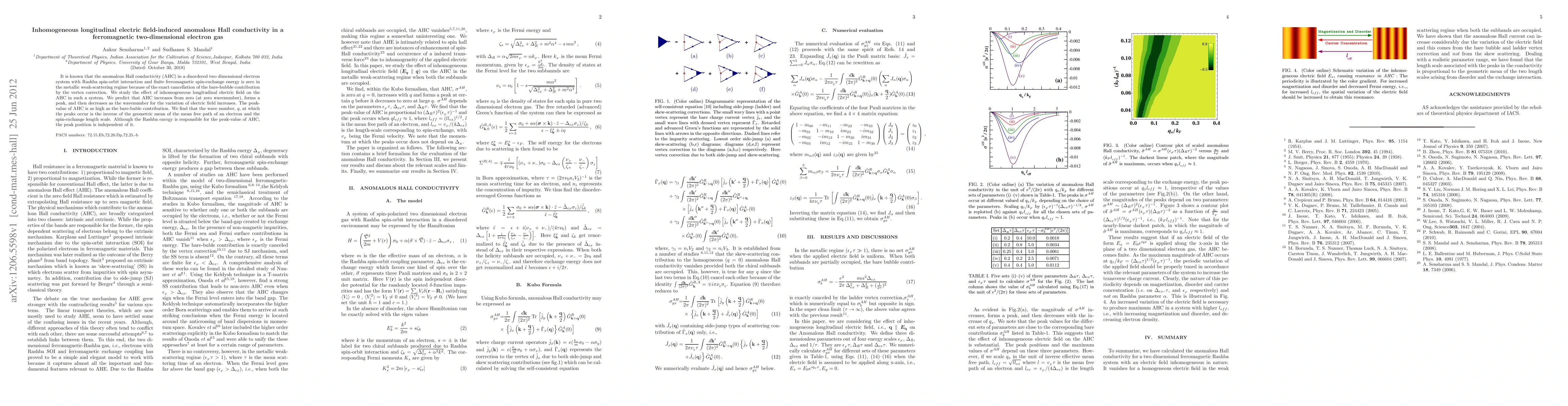 It is known that the anomalous Hall conductivity (AHC) in a disordered two dimensional electron system with Rashba spin-orbit interaction and finite ferromagnetic spin-exchange energy is zero in the metallic weak-scattering regime because of the exact cancellation of the bare-bubble contribution by the vertex correction. We study the effect of inhomogeneous longitudinal electric field on the AHC in such a system. We predict that AHC increases from zero (at zero wavenumber), forms a peak, and then decreases as the wavenumber for the variation of electric field increases. The peak-value of AHC is as high as the bare-buble contribution. We find that the wave number, q, at which the peaks occur is the inverse of the geometric mean of the mean free path of an electron and the spin-exchange length scale. Although the Rashba energy is responsible for the peak-value of AHC, the peak position is independent of it.