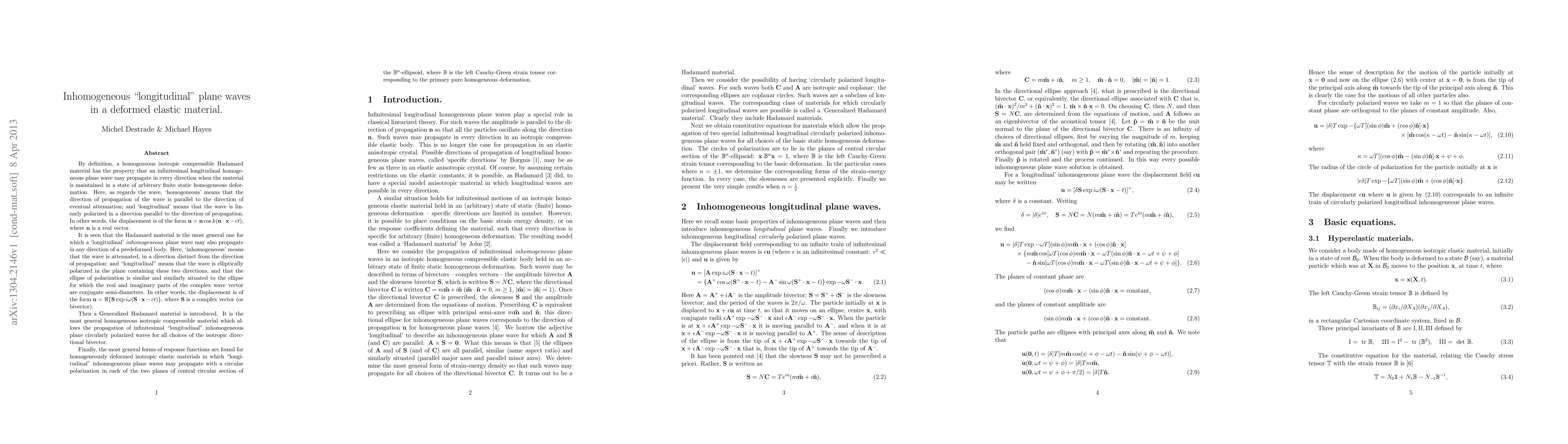 This research explores the propagation of longitudinal plane waves in deformed elastic materials, specifically focusing on Hadamard materials. It identifies conditions under which 'inhomogeneous' longitudinal waves can propagate in any direction within a predeformed body, introducing the concept of Generalized Hadamard materials to accommodate circularly polarized waves.