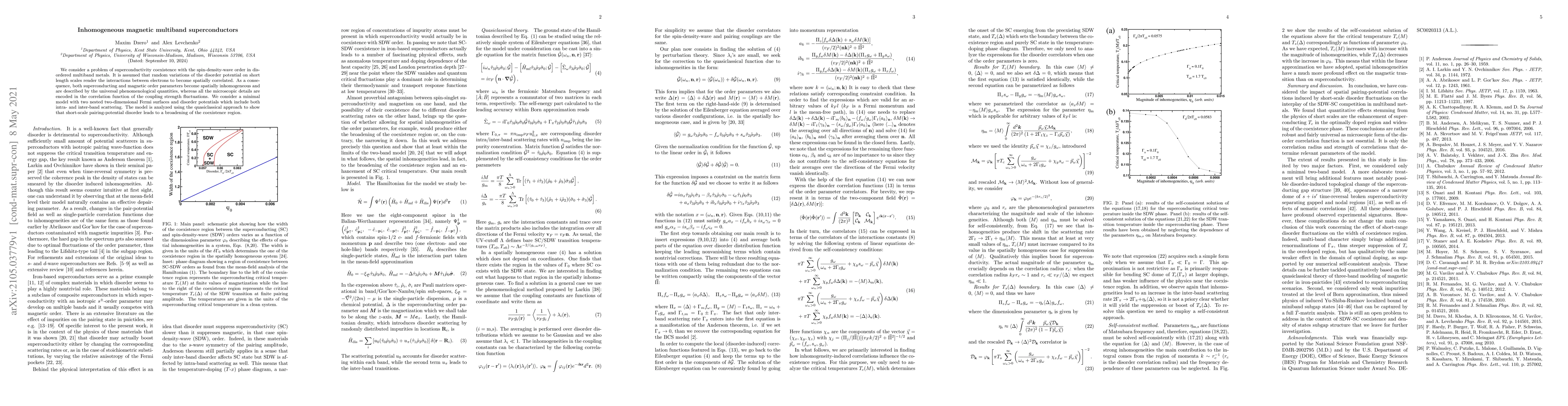 We consider a problem of superconductivity coexistence with the spin-density-wave order in disordered multiband metals. It is assumed that random variations of the disorder potential on short length scales render the interactions between electrons to develop spatial correlations. As a consequence, both superconducting and magnetic order parameters become spatially inhomogeneous and are described by the universal phenomenological quantities, whereas all the microscopic details are encoded in the correlation function of the coupling strength fluctuations. We consider a minimal model with two nested two-dimensional Fermi surfaces and disorder potentials which include both intra- and inter-band scattering. The model is analyzed using the quasiclassical approach to show that short-scale pairing-potential disorder leads to a broadening of the coexistence region.