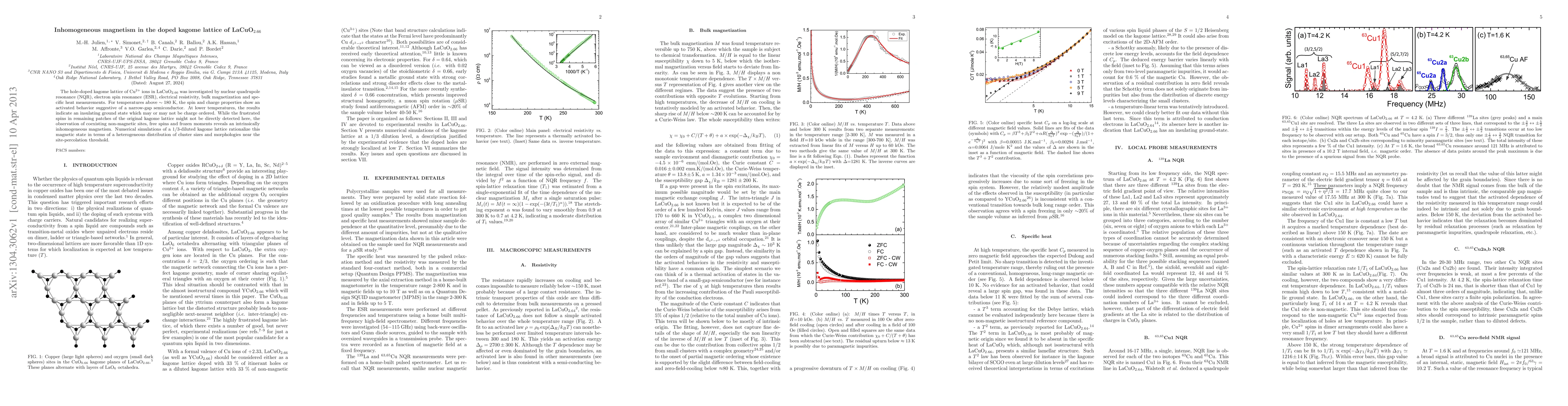 This study investigates the magnetic properties of the doped kagome lattice in LaCuO2.66 using various techniques, revealing an inhomogeneous magnetic state with coexisting non-magnetic sites, free spins, and frozen moments. Numerical simulations suggest a heterogeneous distribution of cluster sizes near the percolation threshold.