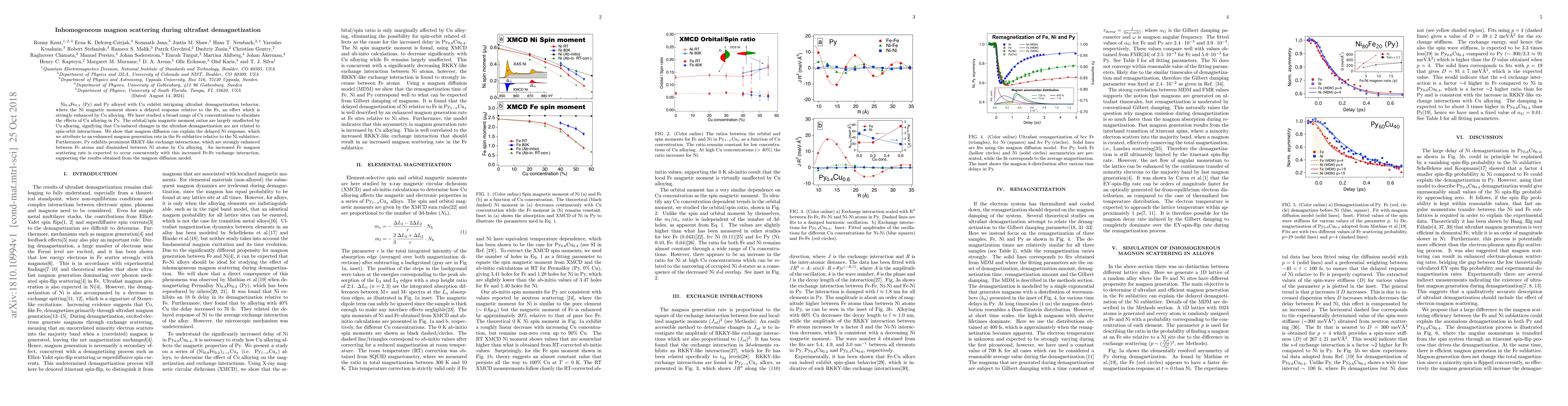 The paper investigates the ultrafast demagnetization behavior in Ni$_{0.8}$Fe$_{0.2}$ (Py) and its Cu-alloyed variants, showing that Cu alloying enhances the delayed response of Ni magnetic moments. Magnon diffusion and increased magnon scattering in the Fe sublattice explain this phenomenon, while Cu diminishes RKKY-like exchange interactions between Ni atoms.