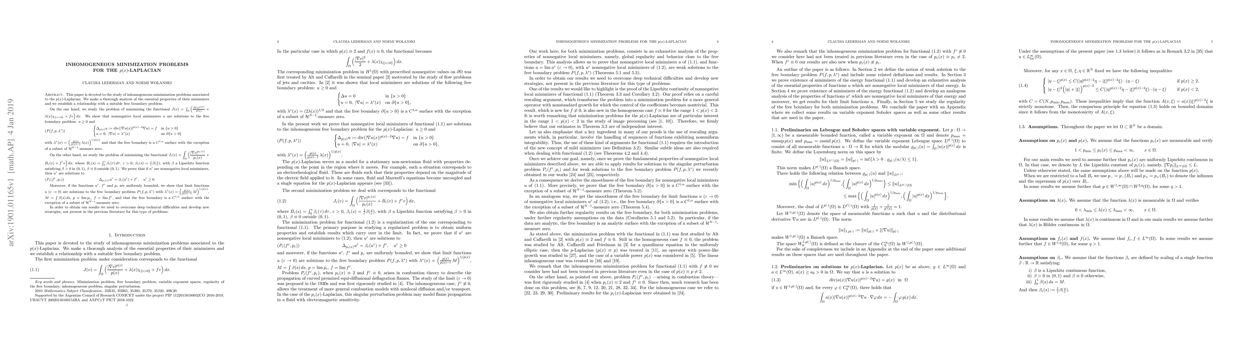 We study an inhomogeneous minimization problems associated to the $p(x)$-Laplacian. We make a thorough analysis of the essential properties of their minimizers and we establish a relationship with a suitable free boundary problem. On the one hand, we study the problem of minimizing the functional $J(v)=\int_\Omega\Big(\frac{|\nabla v|^{p(x)}}{p(x)}+\lambda(x)\chi_{\{v>0\}}+fv\Big)\,dx$. We show that nonnegative local minimizers $u$ are solutions to the free boundary problem: $u\ge 0$ and \begin{equation} \label{fbp-px}\tag{$P(f,p,{\lambda}^*)$} \begin{cases} \Delta_{p(x)}u:=\mbox{div}(|\nabla u(x)|^{p(x)-2}\nabla u)= f & \mbox{in }\{u>0\}\\ u=0,\ |\nabla u| = \lambda^*(x) & \mbox{on }\partial\{u>0\} \end{cases} \end{equation} with $\lambda^*(x)=\Big(\frac{p(x)}{p(x)-1}\,\lambda(x)\Big)^{1/p(x)}$ and that the free boundary is a $C^{1,\alpha}$ surface. On the other hand, we study the problem of minimizing the functional $J_{\varepsilon}(v)= \int_\Omega \Big(\frac{|\nabla v|^{p_\varepsilon(x)}}{p_\varepsilon(x)}+B_{\varepsilon}(v)+f_\varepsilon v\Big)\, dx$, where $B_\varepsilon(s)=\int _0^s\beta_\varepsilon(\tau) \, d\tau$, $\varepsilon>0$, ${\beta}_{\varepsilon}(s)={1 \over \varepsilon} \beta({s \over \varepsilon})$, with $\beta$ a Lipschitz function satisfying $\beta>0$ in $(0,1)$, $\beta\equiv 0$ outside $(0,1)$. We prove that if $u_\varepsilon$ are nonnegative local minimizers, then any limit function $u$ ($\varepsilon\to 0$) is a solution to the free boundary problem $P(f,p,{\lambda}^*)$ with $\lambda^*(x)=\Big(\frac{p(x)}{p(x)-1}\,M\Big)^{1/p(x)}$, $M=\int \beta(s)\, ds$, $p=\lim p_\varepsilon$, $f=\lim f_\varepsilon$, and that the free boundary is a $C^{1,\alpha}$ surface. In order to obtain our results we need to overcome deep technical difficulties and develop new strategies, not present in the previous literature for this type of problems.