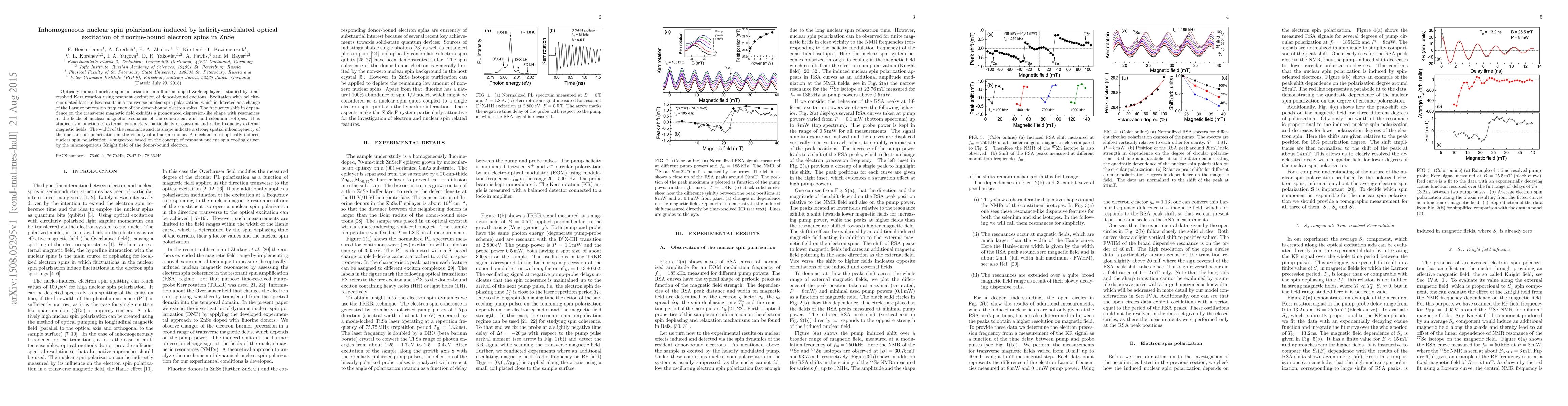 This paper investigates the optically-induced nuclear spin polarization in fluorine-doped ZnSe using time-resolved Kerr rotation and helicity-modulated laser pulses. The study reveals a transverse nuclear spin polarization with a dispersion-like frequency shift, indicating strong spatial inhomogeneity near fluorine donors, suggesting a mechanism of resonant nuclear spin cooling driven by the inhomogeneous Knight field.