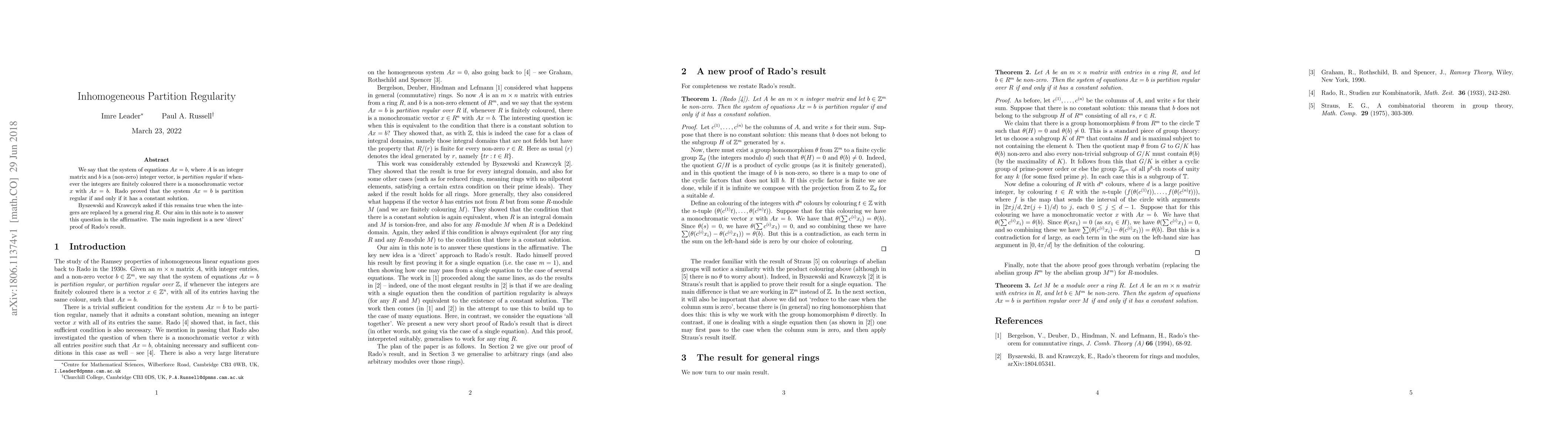This paper investigates the partition regularity of the equation $Ax=b$ in a general ring $R$, proving that it holds if and only if a constant solution exists. The authors provide a new direct proof of Rado's theorem to affirm Byszewski and Krawczyk's question.