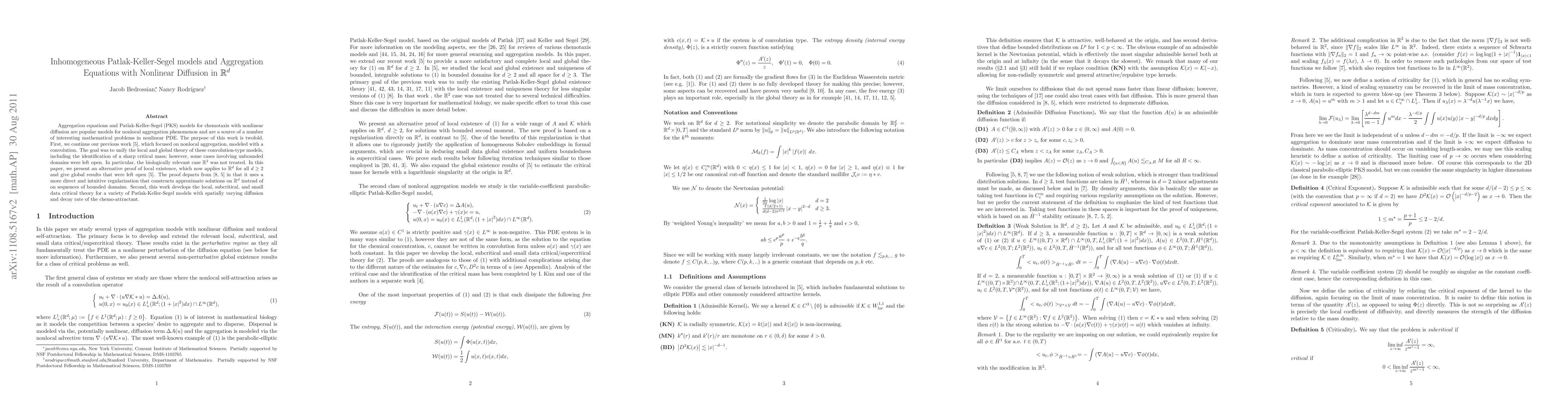 Aggregation equations and Patlak-Keller-Segel (PKS) models for chemotaxis with nonlinear diffusion are popular models for nonlocal aggregation phenomenon and are a source of a number of interesting mathematical problems in nonlinear PDE. The purpose of this work is twofold. First, we continue our previous work, which focused on nonlocal aggregation, modeled with a convolution. The goal was to unify the local and global theory of these convolution-type models, including the identification of a sharp critical mass; however, some cases involving unbounded domains were left open. In particular, the biologically relevant case $\Real^2$ was not treated. In this paper, we present an alternative proof of local existence, which now applies to $\Real^d$ for all $d \geq 2$ and give global results that were left open. The proof departs from previous work in that it uses a more direct and intuitive regularization that constructs approximate solutions on $\Real^d$ instead of on sequences of bounded domains. Second, this work develops the local, subcritical, and small data critical theory for a variety of Patlak-Keller-Segel models with spatially varying diffusion and decay rate of the chemo-attractant.
