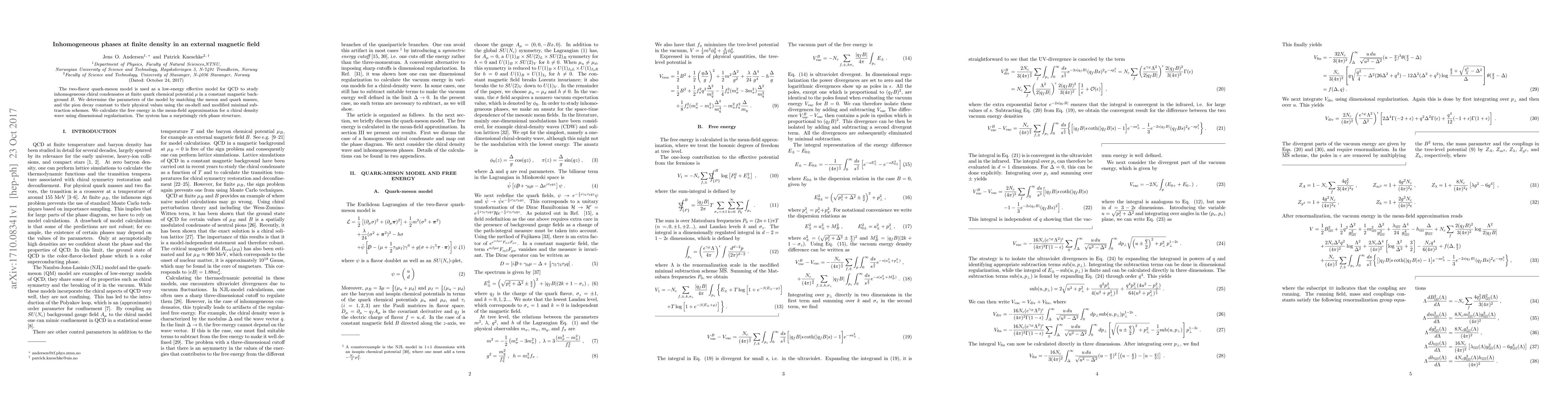 The two-flavor quark-meson model is used as a low-energy effective model for QCD to study inhomogeneous chiral condensates at finite quark chemical potential $\mu$ in a constant magnetic background $B$. We determine the parameters of the model by matching the meson and quark masses, and the pion decay constant to their physical values using the on-shell and modified minimal subtraction schemes. We calculate the free energy in the mean-field approximation for a chiral density wave using dimensional regularization. The system has a surprisingly rich phase structure.