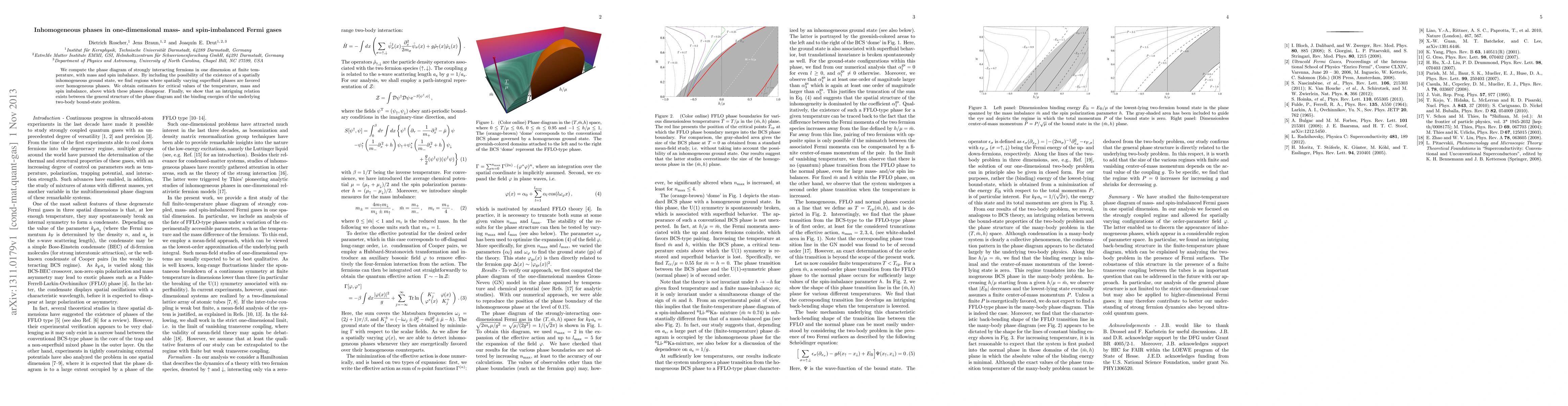 This study explores the phase behavior of one-dimensional fermion gases with mass and spin imbalance, finding regions where spatially varying superfluid phases emerge at finite temperature.