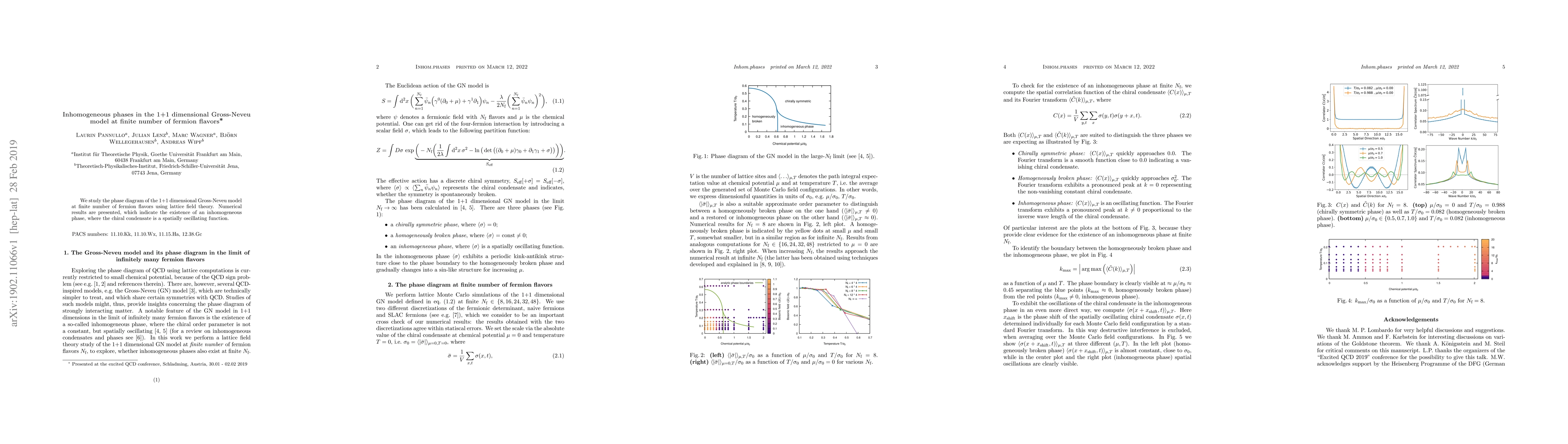 Summary: This study explores the phase diagram of the 1+1 dimensional Gross-Neveu model with a finite number of fermion flavors using lattice field theory, revealing the presence of an inhomogeneous phase characterized by a spatially oscillating chiral condensate.