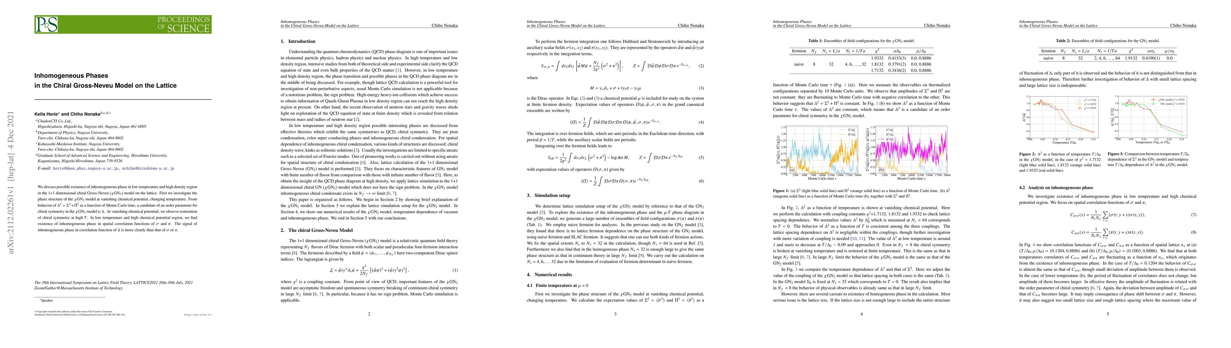 We discuss possible existence of inhomogeneous phase in low temperature and high density region in the 1+1 dimensional chiral Gross-Neveu ( $\chi$GN$_2$ ) model on the lattice. First we investigate the phase structure of the $\chi$GN$_2$ model at vanishing chemical potential, changing temperature. From behavior of $\Delta^2 = \Sigma^2 + \Pi^2$ as a function of Monte Carlo time, a candidate of an order parameter for chiral symmetry in the $\chi$GN$_2$ model is $\Delta$. At vanishing chemical potential, we observe restoration of chiral symmetry at high $T$. In low temperature and high chemical potential region, we find existence of inhomogeneous phase in spatial correlation functions of $\sigma$ and $\pi$. The signal of inhomogeneous phase in correlation function of $\Delta$ is more clearly than that of $\sigma$ or $\pi$.