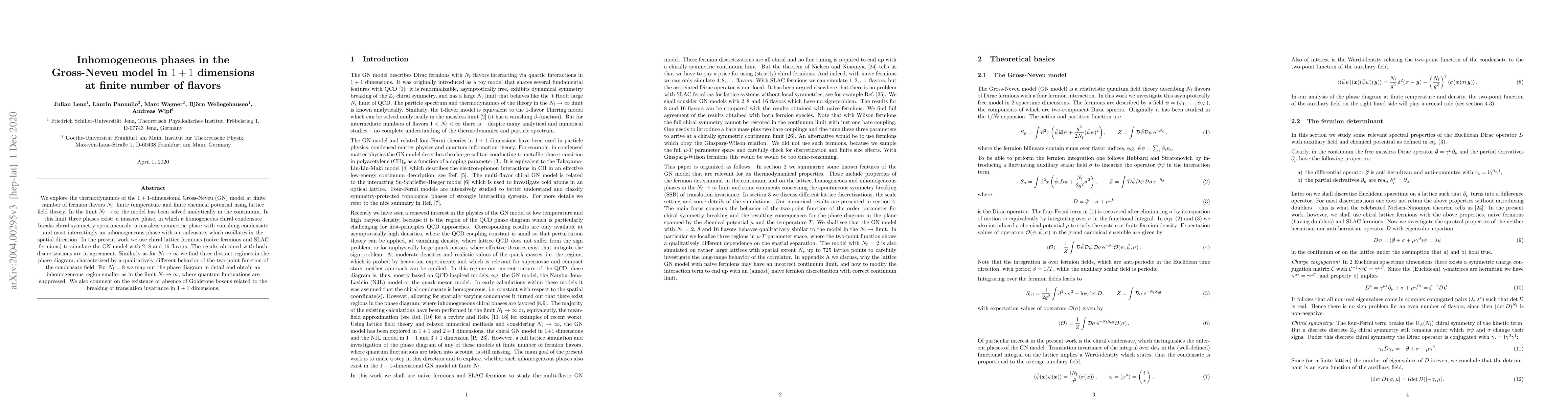 This paper investigates the thermodynamics of the 1+1-dimensional Gross-Neveu model at finite fermion flavors, temperature, and chemical potential using lattice field theory. It finds three distinct phases, including an inhomogeneous phase with a spatially oscillating condensate, and confirms the presence of these phases for finite flavors, though the inhomogeneous region is smaller than in the infinite flavor limit.