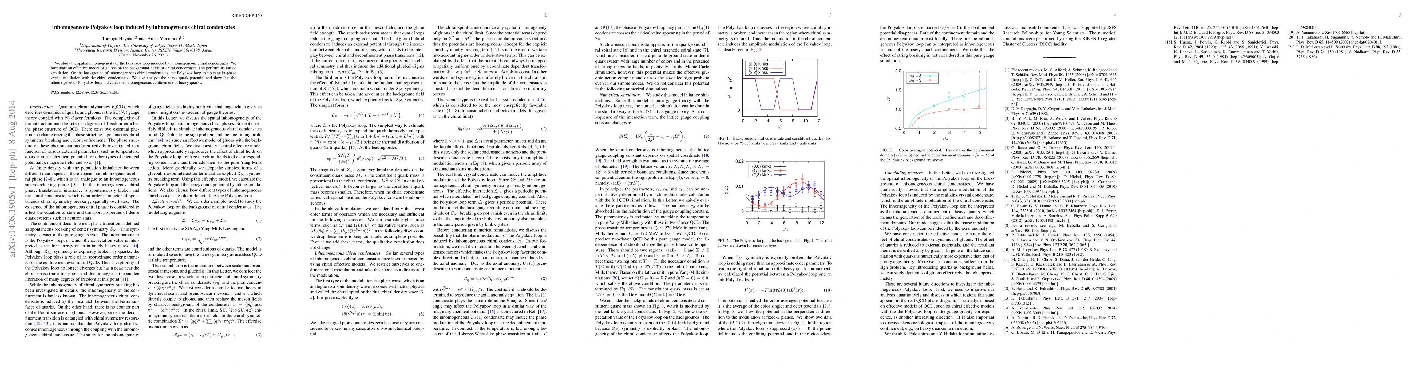 This paper investigates how spatial inhomogeneity in chiral condensates affects the Polyakov loop, using an effective gluon model and lattice simulations. The study finds that the Polyakov loop oscillates in phase with the chiral condensates, suggesting inhomogeneous confinement of heavy quarks.