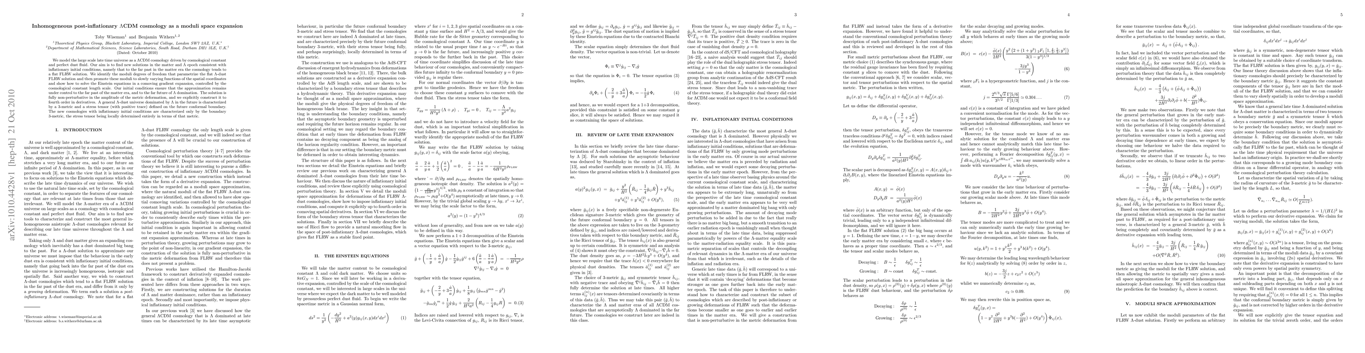 This paper explores inhomogeneous Lambda-CDM cosmologies by expanding the moduli space of flat FLRW solutions, solving the Einstein equations in a comoving gradient expansion, and constructing non-perturbative solutions to fourth order. The solutions are consistent with inflationary initial conditions and are characterized by the future boundary 3-metric and locally determined stress tensor.