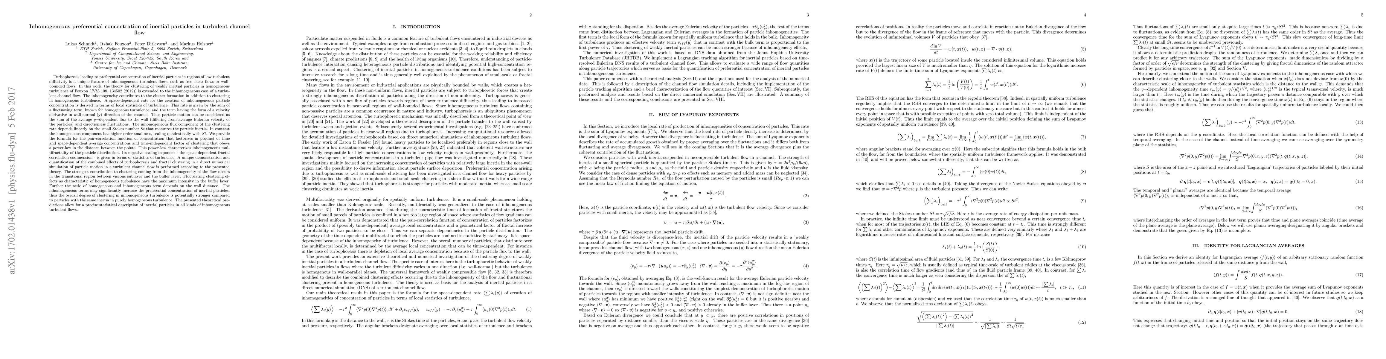 This paper extends the theory of inertial particle clustering in homogeneous turbulence to turbulent channel flow, demonstrating that inhomogeneity enhances clustering through turbophoresis. The study derives a formula for the pair-correlation function of particle concentration, showing a power-law dependence on distance, and highlights that inhomogeneity significantly increases clustering in the transitional region between the viscous sublayer and buffer layer.