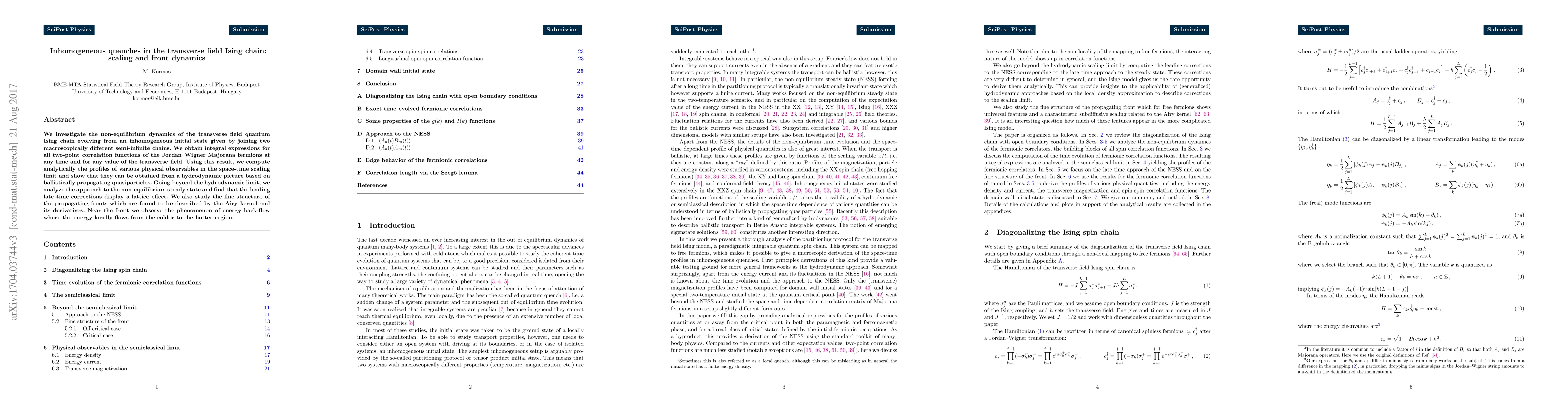 This paper studies the non-equilibrium dynamics of the transverse field Ising chain starting from an inhomogeneous initial state, deriving expressions for correlation functions and analyzing the space-time scaling limit. It reveals a hydrodynamic picture with ballistic quasiparticles and lattice effects in the late-time corrections, along with the phenomenon of energy back-flow near the propagating fronts.