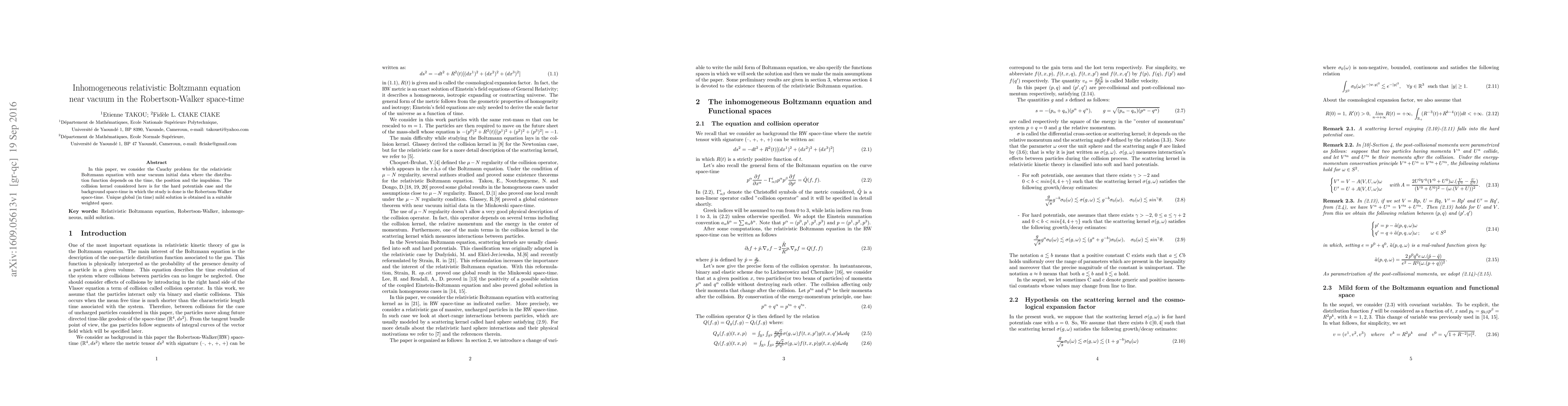In this paper, we consider the Cauchy problem for the relativistic Boltzmann equation with near vacuum initial data where the distribution function depends on the time, the position and the impulsion. The collision kernel considered here is for the hard potentials case and the background space-time in which the study is done is the Robertson-Walker space-time. Unique global (in time) mild solution is obtained in a suitable weighted space.