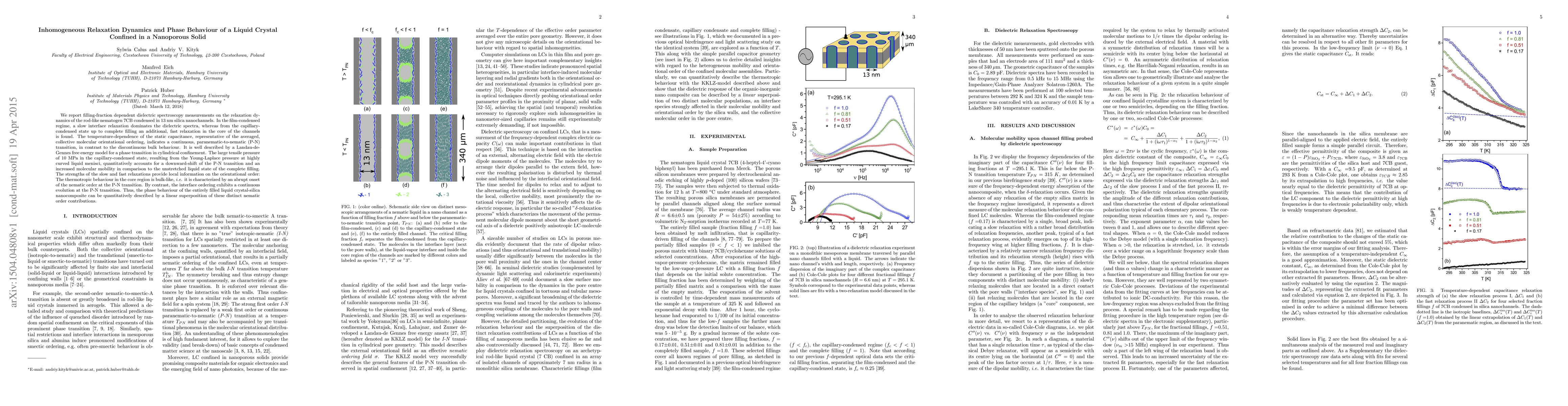 We report filling-fraction dependent dielectric spectroscopy measurements on the relaxation dynamics of the rod-like nematogen 7CB condensed in 13 nm silica nanochannels. In the film-condensed regime, a slow interface relaxation dominates the dielectric spectra, whereas from the capillary-condensed state up to complete filling an additional, fast relaxation in the core of the channels is found. The temperature-dependence of the static capacitance, representative of the averaged, collective molecular orientational ordering, indicates a continuous, paranematic-to-nematic (P-N) transition, in contrast to the discontinuous bulk behaviour. It is well described by a Landau-de-Gennes free energy model for a phase transition in cylindrical confinement. The large tensile pressure of 10 MPa in the capillary-condensed state, resulting from the Young-Laplace pressure at highly curved liquid menisci, quantitatively accounts for a downward-shift of the P-N transition and an increased molecular mobility in comparison to the unstretched liquid state of the complete filling. The strengths of the slow and fast relaxations provide local information on the orientational order: The thermotropic behaviour in the core region is bulk-like, i.e. it is characterized by an abrupt onset of the nematic order at the P-N transition. By contrast, the interface ordering exhibits a continuous evolution at the P-N transition. Thus, the phase behaviour of the entirely filled liquid crystal-silica nanocomposite can be quantitatively described by a linear superposition of these distinct nematic order contributions.