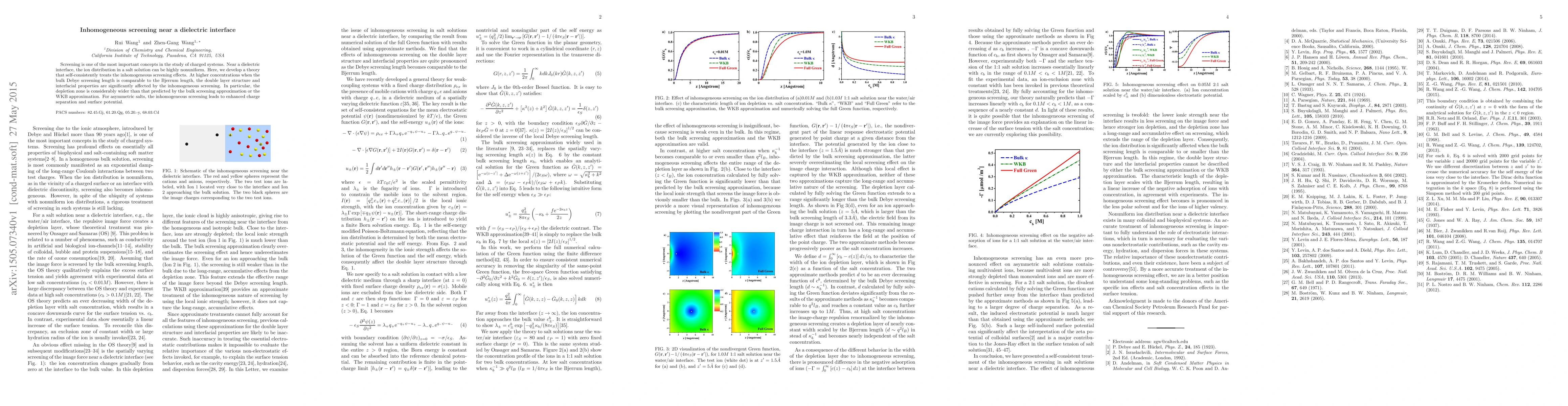 This paper develops a theory to address inhomogeneous screening effects near dielectric interfaces, showing that higher concentrations lead to a wider depletion zone and enhanced charge separation compared to bulk screening approximations. The model reveals significant impacts on double layer structure and interfacial properties for asymmetric salts.