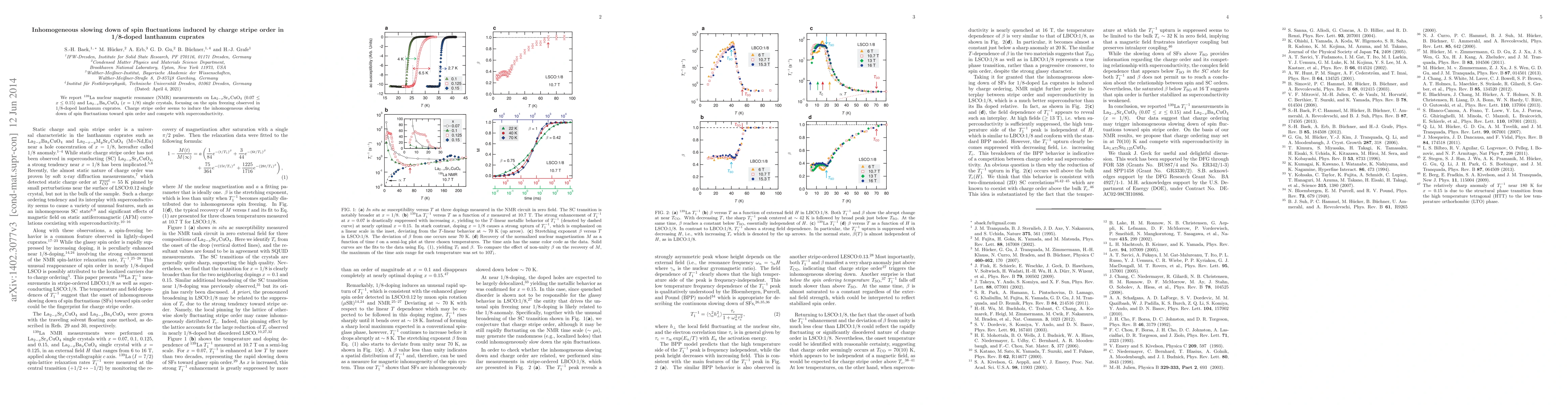 Summary: This study uses $^{139}$La NMR to investigate the effects of charge stripe order in 1/8-doped lanthanum cuprates, revealing an inhomogeneous slowing down of spin fluctuations that competes with superconductivity. The findings highlight the complex interplay between charge order and magnetic dynamics in these materials.