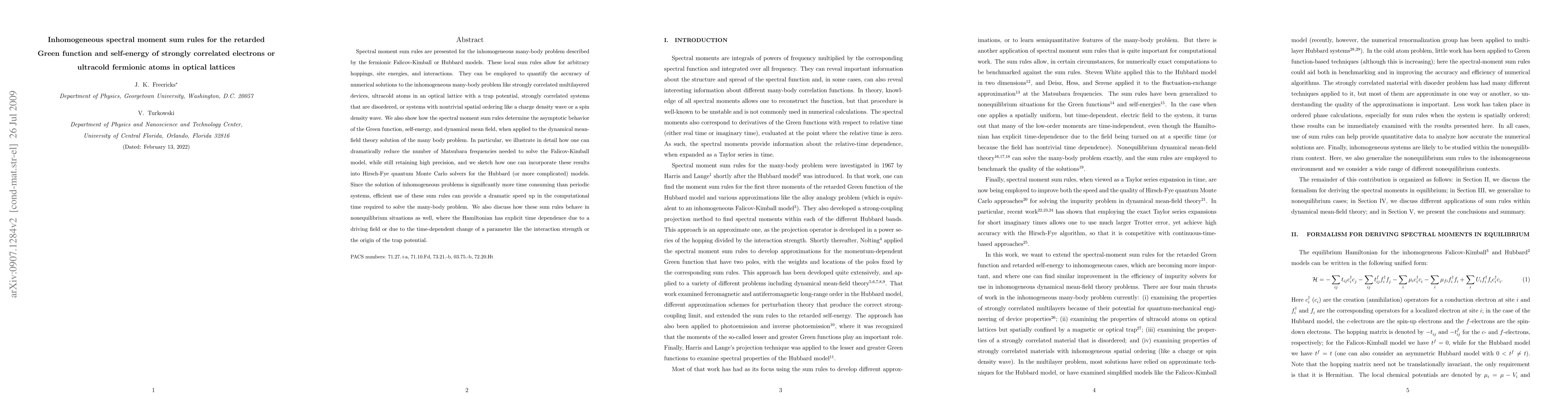 This paper presents spectral moment sum rules for the retarded Green function and self-energy in inhomogeneous many-body systems, applicable to the Falicov-Kimball and Hubbard models. These rules enable efficient numerical solutions for strongly correlated systems, significantly reducing computational time and extending to nonequilibrium scenarios.