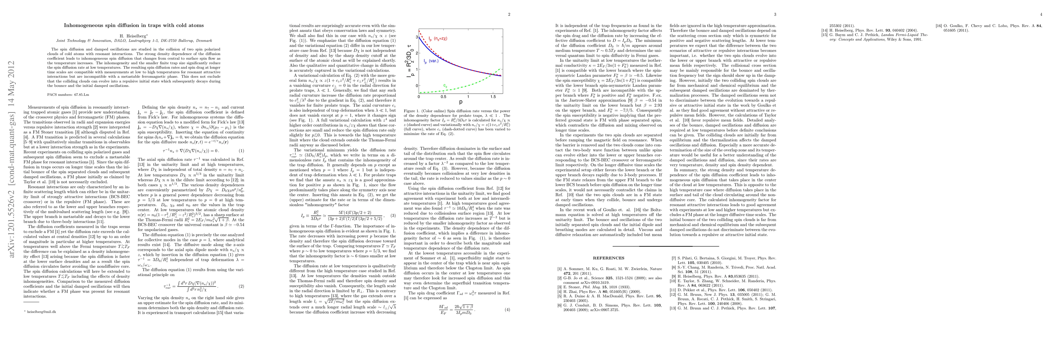This study investigates spin diffusion in cold atoms, revealing inhomogeneous behavior due to strong density dependence, transitioning from central to surface spin flow with temperature increase. The findings are consistent with measurements across temperature ranges but contradict the existence of a metastable ferromagnetic phase.