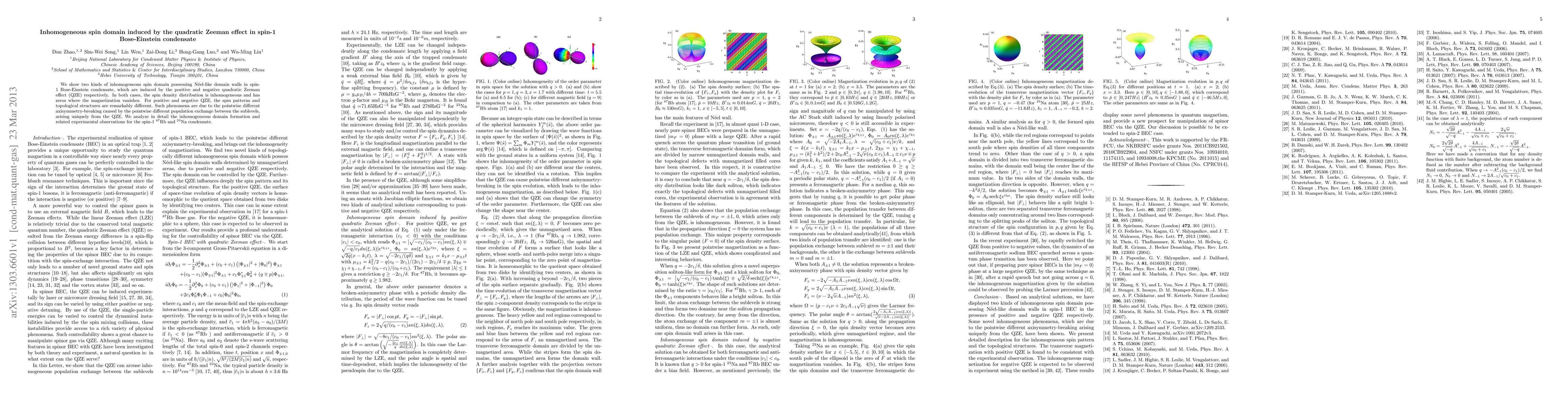 This paper investigates the formation of inhomogeneous spin domains in spin-1 Bose-Einstein condensates induced by positive and negative quadratic Zeeman effect, revealing distinct N\'eel-like domain walls and topological structures due to different axisymmetry-breaking and population exchange between sublevels. Detailed analysis is provided for $^{87}$Rb and $^{23}$Na condensates.