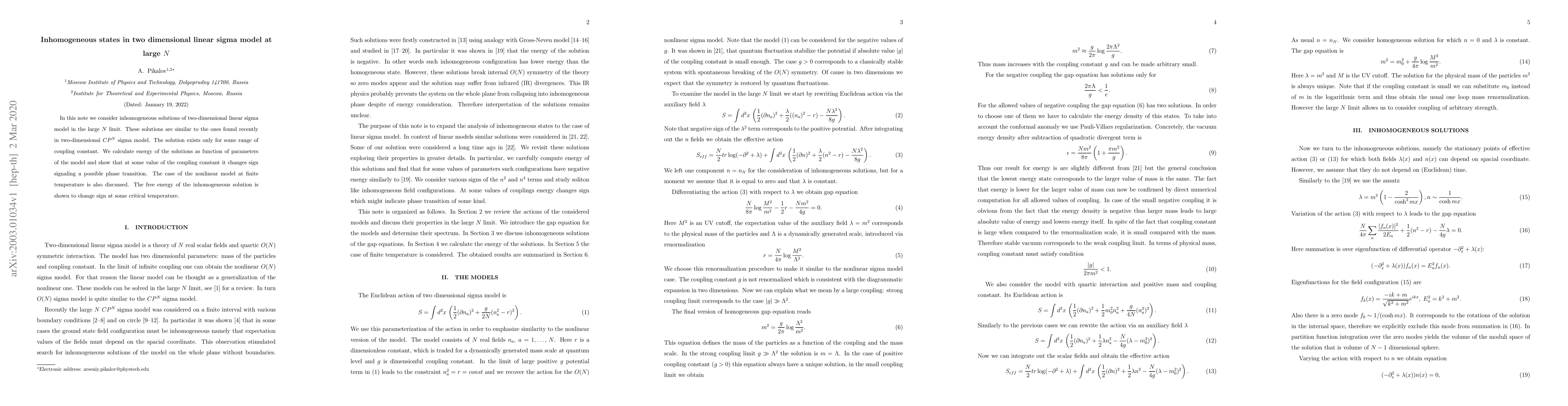 This paper investigates inhomogeneous solutions of the two-dimensional linear sigma model in the large $N$ limit, showing they exist only within a specific coupling range and signaling a phase transition at a critical coupling constant. The study also examines the nonlinear model at finite temperature, finding a sign change in free energy at a critical temperature.