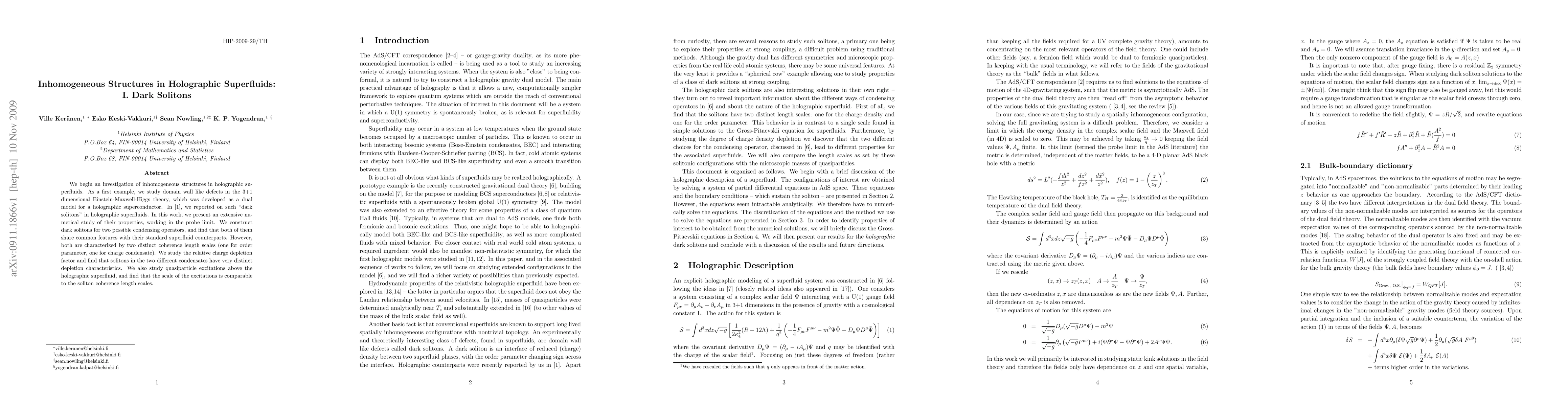 We begin an investigation of inhomogeneous structures in holographic superfluids. As a first example, we study domain wall like defects in the 3+1 dimensional Einstein-Maxwell-Higgs theory, which was developed as a dual model for a holographic superconductor. In [1], we reported on such "dark solitons" in holographic superfluids. In this work, we present an extensive numerical study of their properties, working in the probe limit. We construct dark solitons for two possible condensing operators, and find that both of them share common features with their standard superfluid counterparts. However, both are characterized by two distinct coherence length scales (one for order parameter, one for charge condensate). We study the relative charge depletion factor and find that solitons in the two different condensates have very distinct depletion characteristics. We also study quasiparticle excitations above the holographic superfluid, and find that the scale of the excitations is comparable to the soliton coherence length scales.
