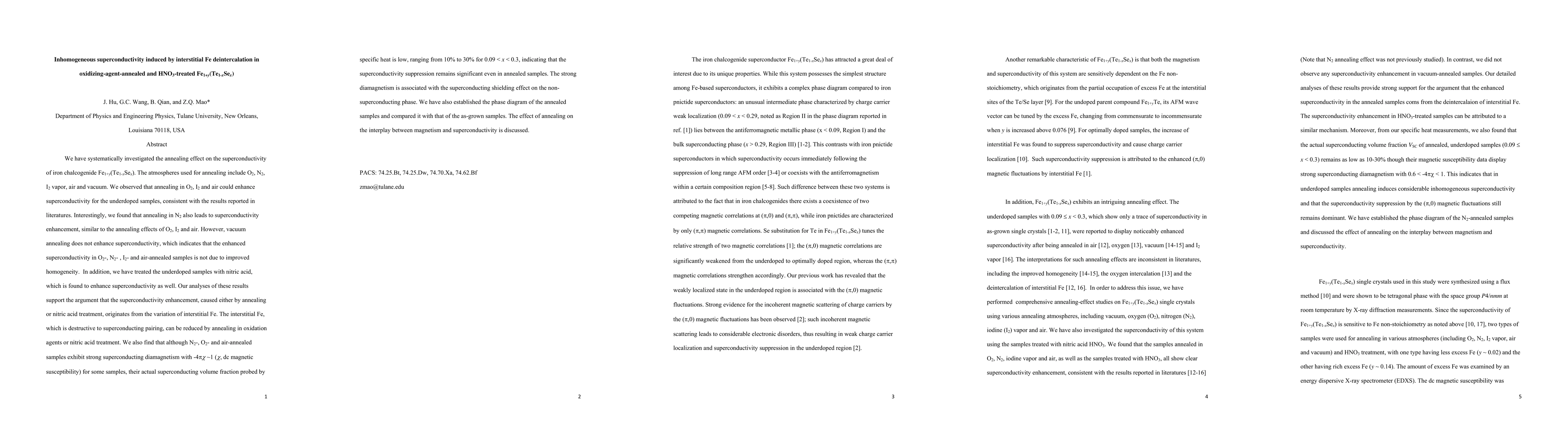 Researchers found that annealing iron chalcogenide samples in oxygen, nitrogen, and air enhances superconductivity, while vacuum and nitric acid treatment have no effect, suggesting a link between interstitial Fe reduction and superconductivity.