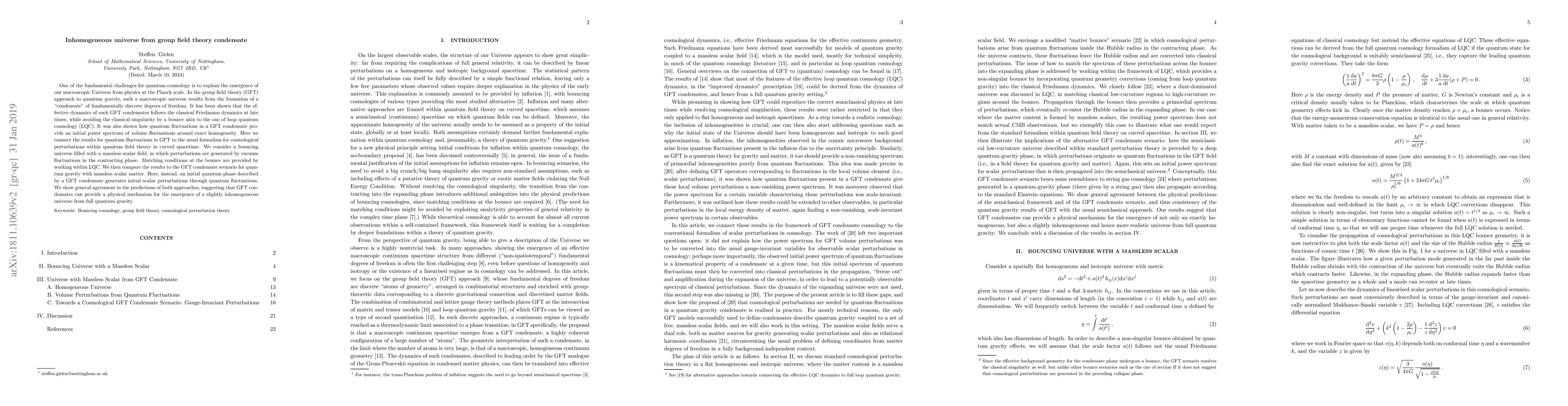 This paper explores how group field theory (GFT) condensates can explain the emergence of a slightly inhomogeneous macroscopic universe from quantum gravity. It demonstrates that GFT condensates generate initial scalar perturbations through quantum fluctuations, showing general agreement with predictions from loop quantum cosmology (LQC) for a bouncing universe.