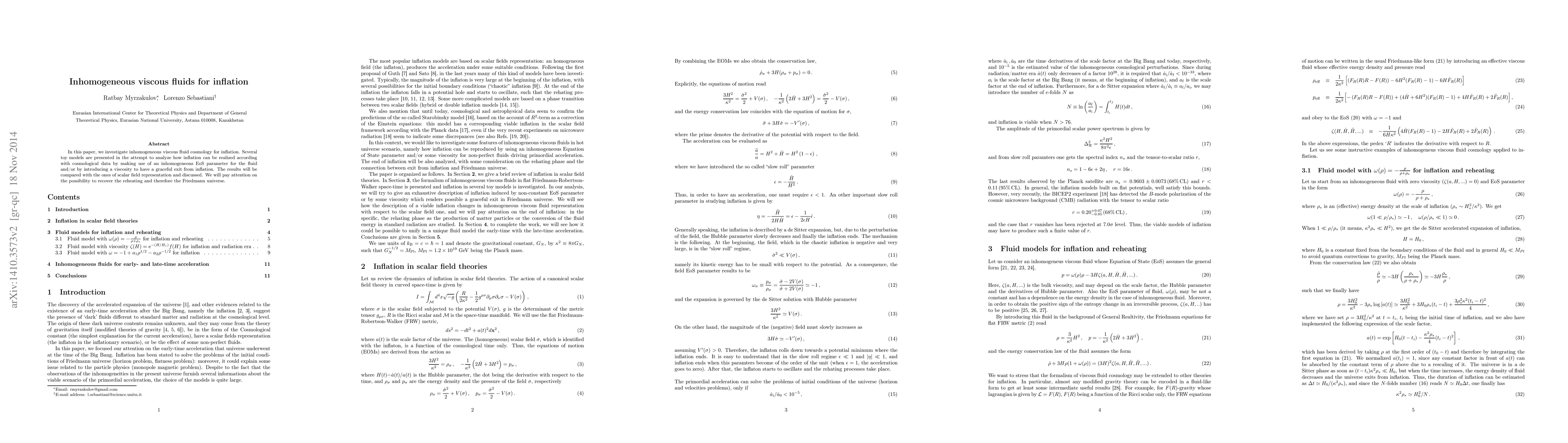 This paper explores inhomogeneous viscous fluid models for inflation, proposing several toy models to analyze how inflation can align with cosmological data using an inhomogeneous equation of state and viscosity for a graceful exit. The findings are compared with scalar field models, focusing on the potential for reheating and the transition to a Friedmann universe.