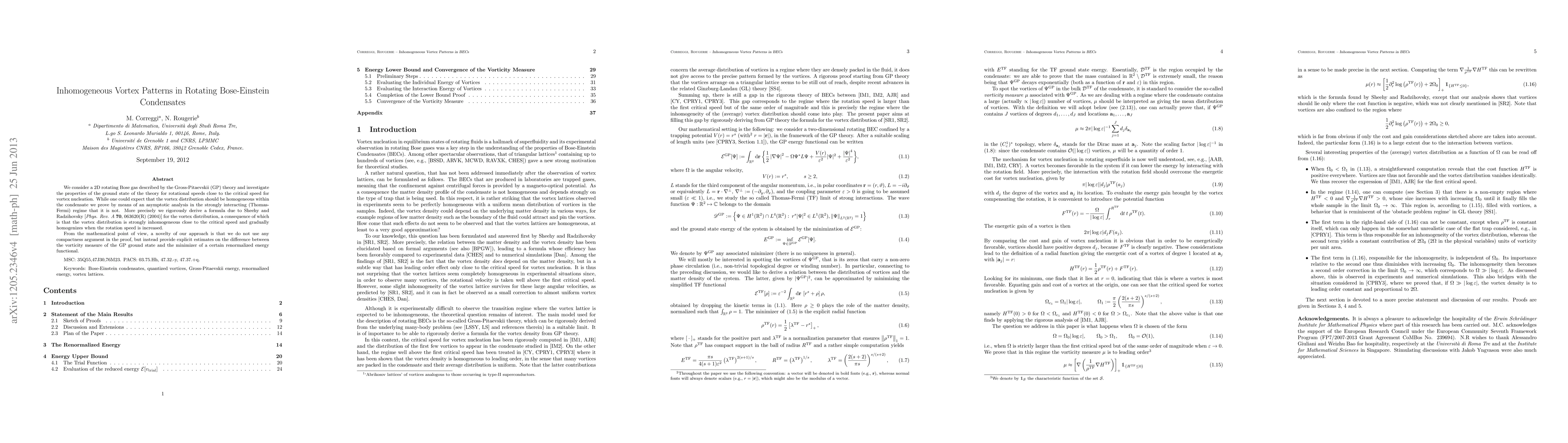 This research derives a formula for inhomogeneous vortex patterns in rotating Bose-Einstein condensates near critical rotation speeds, contradicting the expectation of a homogeneous distribution. The methodology involves explicit estimates without compactness arguments, focusing on the difference between GP ground state vorticity and a renormalized energy functional's minimizer.