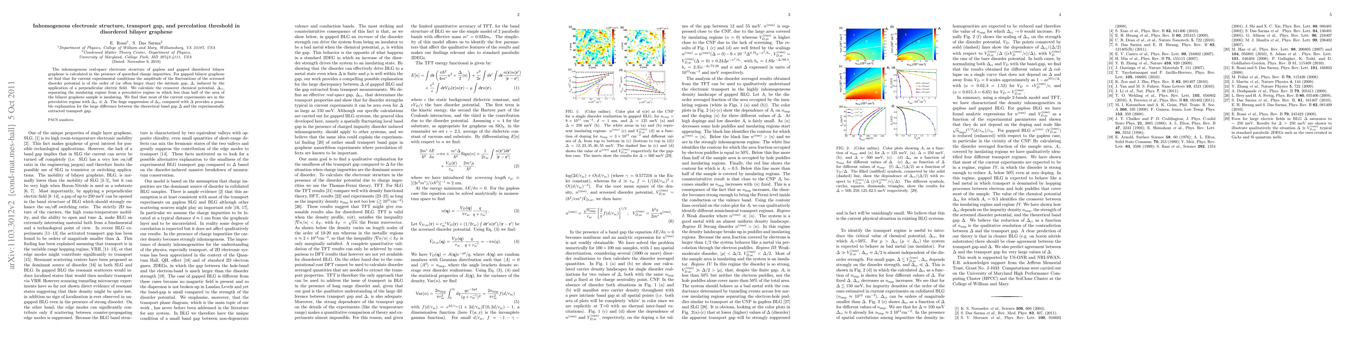 This paper investigates the electronic structure and transport properties of disordered bilayer graphene under charge impurities, finding that the intrinsic gap induced by electric fields is often exceeded by disorder potential fluctuations. It identifies a percolative regime with a significantly reduced crossover chemical potential, explaining the discrepancy between theoretical and experimental transport gaps.